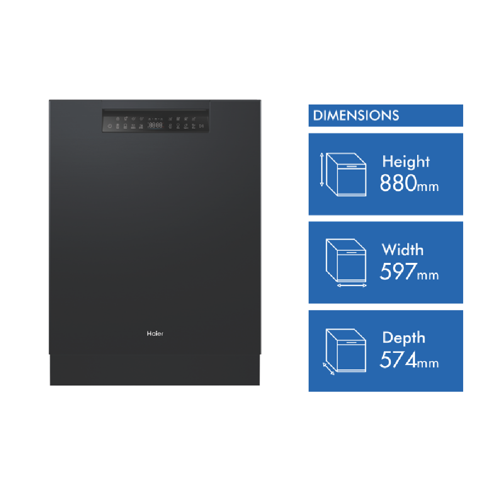 Tired of dirty dishes piling up? The Haier HDW15U3B1 built under dishwasher in sleek black is here to help. With its steam function and 15 place settings you can easily tackle even the toughest messes. The 42 decibel noise level means it won't disrupt your daily life. Plus the 4.5 star energy rating and 5.5 star WELS water rating ensure efficiency. The electronic touch controls and Wi-Fi connectivity with the SmartHQ app make operation a breeze. Measuring 597mm wide 574mm deep and 820-888mm high it fits seamlessly under your counter. Enjoy peace of mind with the 2 year manufacturer's warranty.