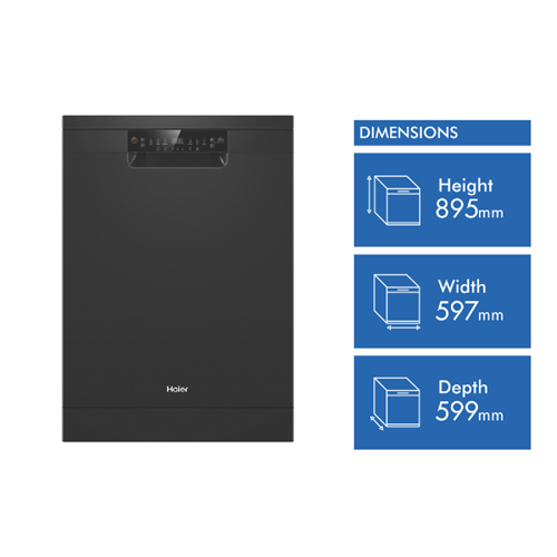 This sleek Haier freestanding dishwasher offers the ultimate in modern convenience. With a generous 15 place settings and 6 wash programs including 60 Min Auto Eco Glass Heavy and Normal this appliance can handle even the biggest loads with ease. The adjustable height racks and foldable plate supports provide flexible loading options. While the Eco program helps conserve resources using only 12.2 litres of water per wash and achieving a high 5 star WELS water rating. With a 4 star energy rating this dishwasher operates at a quiet 47 decibels. Safety is a priority too with child lock and flood protection features. Measuring 597mm W x 895mm H x 599mm D this freestanding dishwasher is Wi-Fi enabled. Allowing you to control and monitor your dishwasher remotely using the SmartHQ app. Helpful alerts provide added peace of mind. With a contemporary black finish and 2 year manufacturer's warranty this Haier dishwasher delivers exceptional performance. The manufacturer's part number for this product is HDW15F2B1. See the complete range online today.