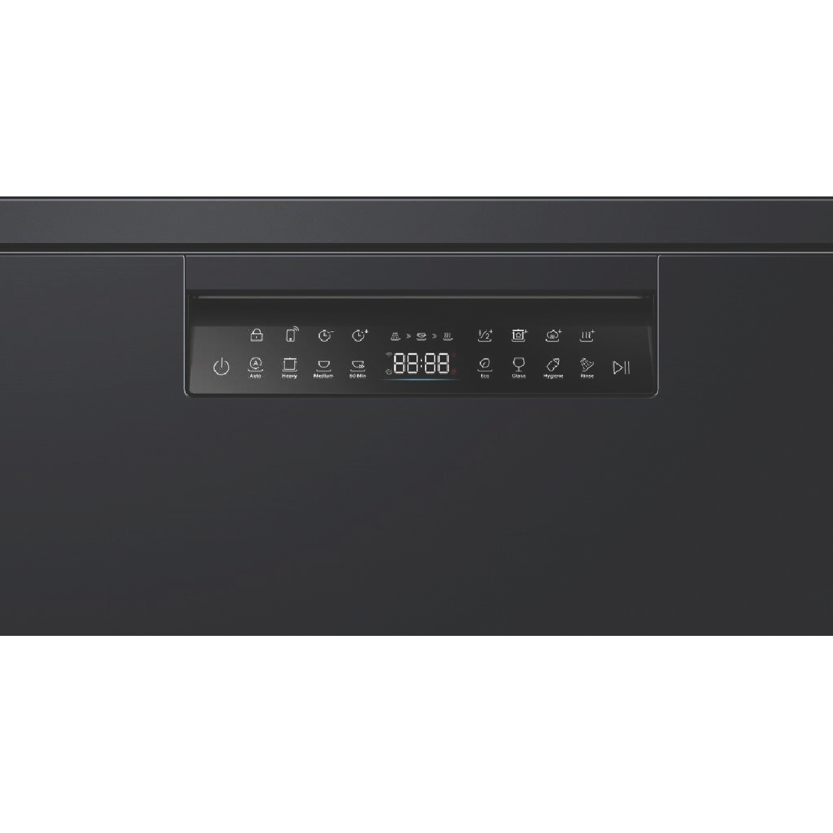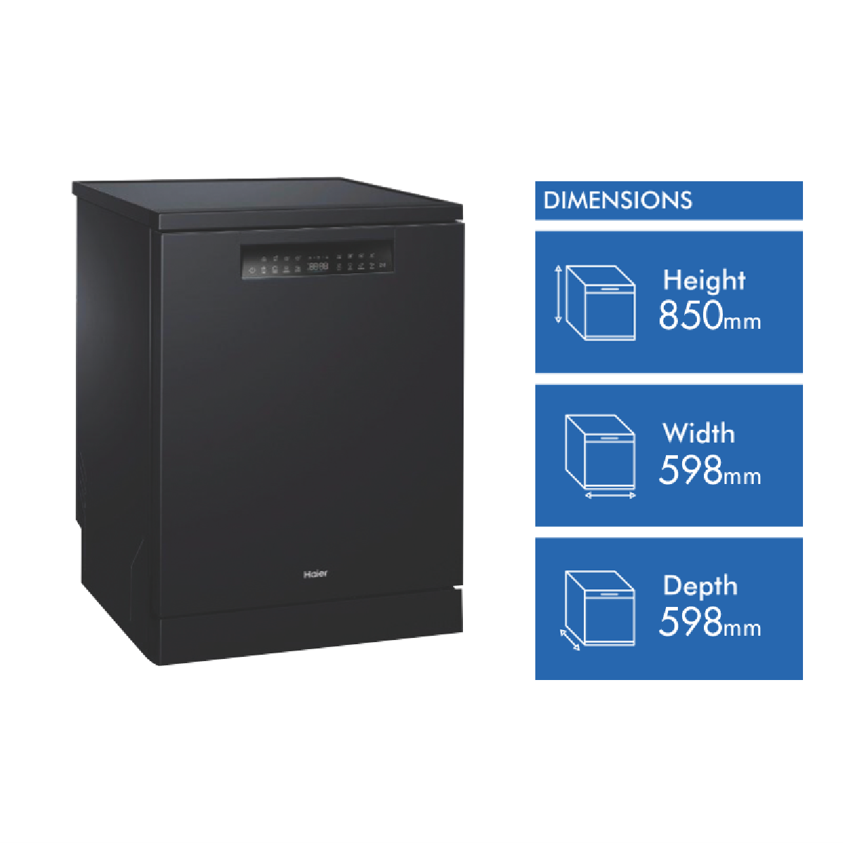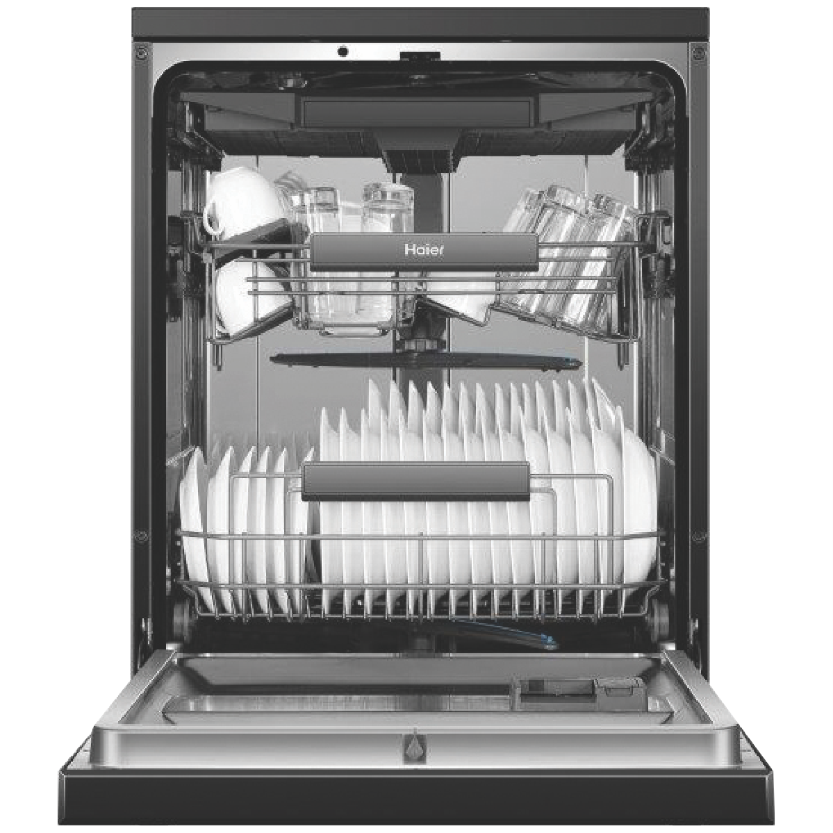 Bring home a dishwasher that makes cleaning up after meals an effortless task. The Haier HDW15F3B1 Freestanding Dishwasher in sleek black features 15 place settings to accommodate large households. With 10 wash programs including Auto Eco Fast Glass Heavy Hygiene Mix Pre-Rinse Saving and Half Load this appliance adapts to handle every kind of load. The adjustable upper basket goes up or down to fit tall items while the foldable plate racks create more room for pots and pans. Wash only half loads without wasting water thanks to the nifty half load setting. Dishes come out sparkling clean and dry with the Extra Shine and ThermoDry drying system. Operate this dishwasher quietly at just 44 decibels. Anti-bacterial protection ensures 99.9% sanitization to keep dishes hygienic for the whole family. Delay the start so you can run the dishwasher when it suits you. The intuitive control panel stores preferred wash cycles in memory for quick selection next time. With a 4.5 star energy rating and 5.5 star WELS water rating this Haier dishwasher saves resources while delivering an impeccable clean. The manufacturer's part number for this product is HDW15F3B1. See how the Haier Freestanding Dishwasher can make everyday dishwashing simple.