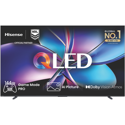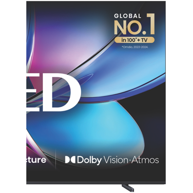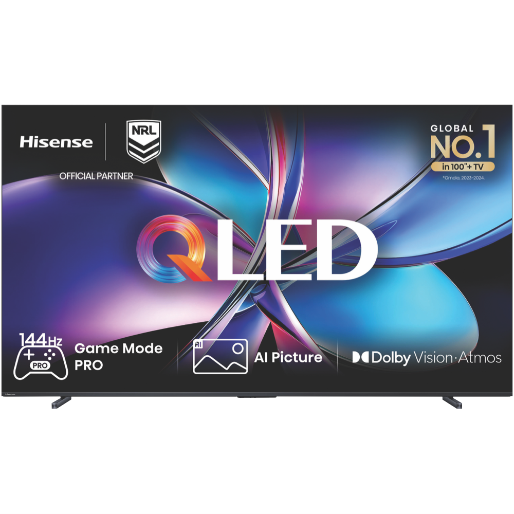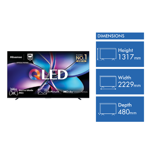 This massive 100 inch QLED TV brings cinema scale entertainment to your home with stunning resolution and vibrant colour making the Hisense 100-inch TV feel like great value. The Hisense Q7QAU delivers impressive visuals with HDR10+ support and a 144Hz refresh rate that keeps fast action looking smooth. Gamers will appreciate FreeSync Premium compatibility and gaming focused features that enhance responsiveness. The slim profile is only 95 mm deep without the stand while Dolby Vision and Dolby Atmos work together to create an immersive viewing and audio experience. Powered by the easy to use VIDAA U8.5 system with Bluetooth 5.0 this smart TV gives you quick access to your favourite streaming apps. It is energy efficient with a 5.5 star rating and backed by a 3 year manufacturer warranty. The Hisense 100Q7QAU is built to impress.