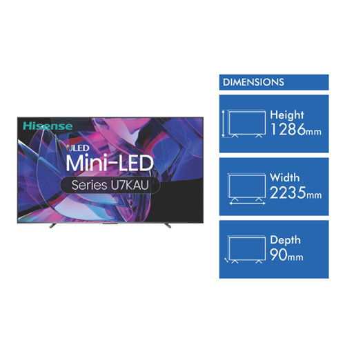 Elevate your home entertainment experience with the stunningly vivid 100 Hisense U7KAU 4K ULED Mini-LED QLED Smart TV. This 2023 model combines a massive ultra-high definition display with Quantum Dot colour technology to immerse you in your favourite movies sports and games. The U7KAU's Mini-LED backlighting delivers superior contrast and blacks for remarkable HDR images. Powered by a quad core processor it upscales lower resolution content to near 4K quality on the 4K panel. Packed with smart features like built-in Alexa and Google Assistant it gives you hands-free voice control. With Dolby Atmos sound 4 HDMI inputs 144Hz refresh rate and Auto Low Latency Mode for lag-free gaming this TV has all the latest specs. And it's all wrapped up in an elegant slim design that looks fantastic in your living room. For the ultimate home theatre look no further than the Hisense 100 U7KAU 4K ULED Mini-LED QLED Smart TV. The manufacturer's part number for this product is 100U7KAU. Bring this cinema-sized 4K TV home today for an unforgettable viewing experience.