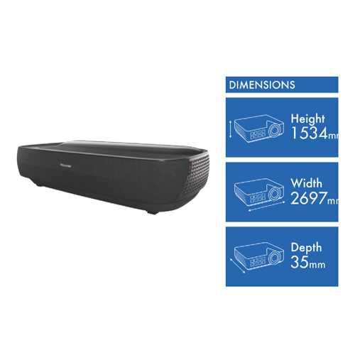 Bring a high-tech cinematic experience into your home with the Hisense 120 Trichroma Laser TV Console & Screen. This stunning 4K Smart Laser TV system delivers an immersive 120 viewing experience with incredible 3840 x 2160 resolution powered by a quad core processor. The VIDAA U6 smart platform gives you easy access to all your favorite streaming apps and content. You'll be blown away by the incredible Dolby Atmos audio that fills the room. With three HDMI inputs and two USB ports you'll have plenty of options to connect media devices game consoles and more. Built-in Wi-Fi and Bluetooth provide wireless connectivity options. At 1534mm high 2697mm wide and just 35mm deep this space-saving laser TV has an ultra-slim design that sits elegantly against your wall. Weighing in at 22.5kg the durable metal construction ensures this TV will provide lasting enjoyment for years to come. Hisense backs this television with a 3 year manufacturer's warranty for added peace of mind. Experience your favorite movies shows games and more like never before on the Hisense 120 Trichroma Laser TV. This is home entertainment taken to new heights. The manufacturer's part number for this product is 120L9HSET. Bring the magic of the movies into your living room today.