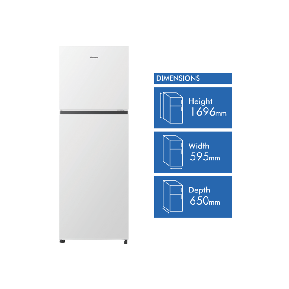 Discover the perfect blend of style and functionality with the Hisense 326L Top Mount Refrigerator. This sleek white fridge offers a generous total capacity of 326L with a spacious 253L fridge compartment and a 73L freezer. Enjoy optimal food preservation thanks to the innovative inverter technology Total No Frost system and Multi Airflow design that ensures even cooling throughout. The seamlessly integrated recessed handles add a touch of elegance while the XXL door balcony provides ample storage space for all your essentials. Keep your meats and fish fresh in the dedicated Fresh Zone compartment. With a remarkable 4.5 star energy rating this top mount refrigerator is both energy-efficient and environmentally friendly. The reversible door hinge allows for flexible installation in any kitchen layout. The manufacturer's part number for this product is HRTF325. Upgrade your kitchen with the Hisense 326L Top Mount Refrigerator and experience the convenience of a well-organized and reliable refrigeration solution.