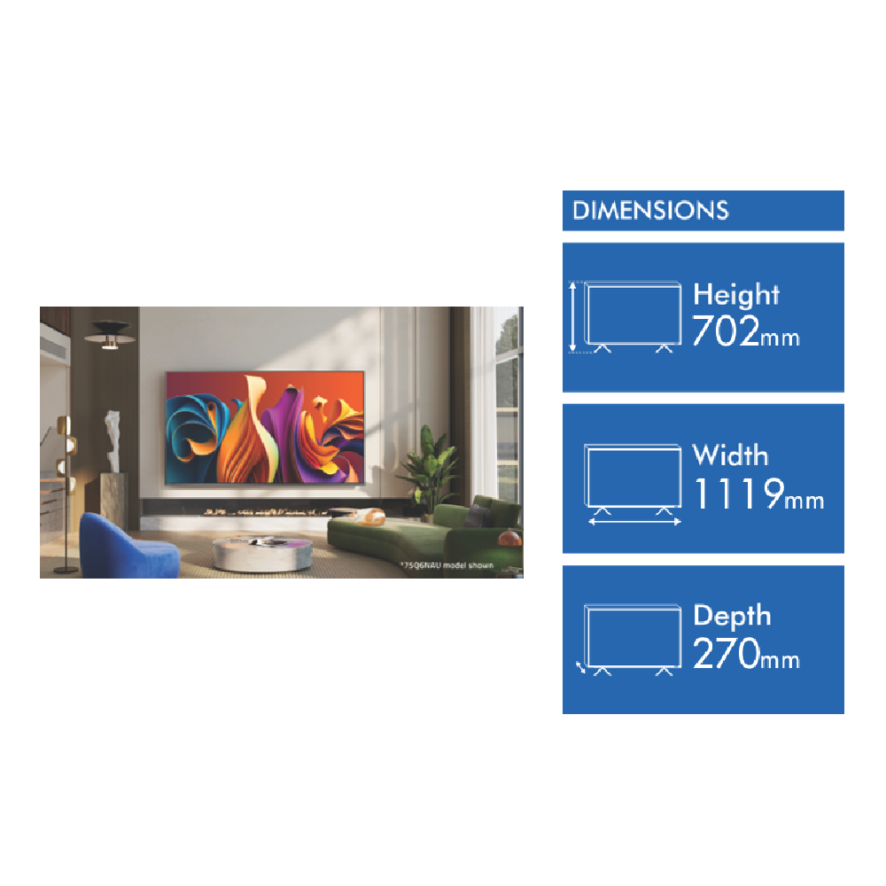 Elevate your home entertainment with the Hisense 50 Q6NAU 4K QLED Smart TV. This stunning television boasts a vibrant 50-inch QLED display with Quantum Dot Colour technology delivering breathtaking visuals in crisp 4K resolution. Immerse yourself in a world of captivating content as the powerful MT9603EAATAC / 4 processor and Micro Dimming enhance picture quality for an unparalleled viewing experience. Enjoy seamless access to your favourite streaming apps like Netflix YouTube Prime Video Disney+ Kayo Foxtel Stan iView and Freeview Plus through the intuitive VIDAA U7 smart TV platform. With built-in Amazon Alexa and Google Assistant hands-free voice control is at your command making navigation effortless. Dolby Vision and HDR 10 support bring cinematic excellence to your living room while Dolby Atmos sound creates an immersive audio experience. Gamers will appreciate the 120 Motion Rate and gaming-ready features for smooth responsive gameplay. Equipped with 3 HDMI inputs and 2 USB ports connecting your devices is a breeze. The sleek design with dimensions of 1119mm width 702mm height and 270mm depth complements any home decor. 50Q6NAU is the manufacturer's part number of this product. Upgrade your TV and embark on a journey of unrivaled entertainment with the Hisense 50 Q6NAU 4K QLED Smart TV backed by a 3-year manufacturer's warranty.