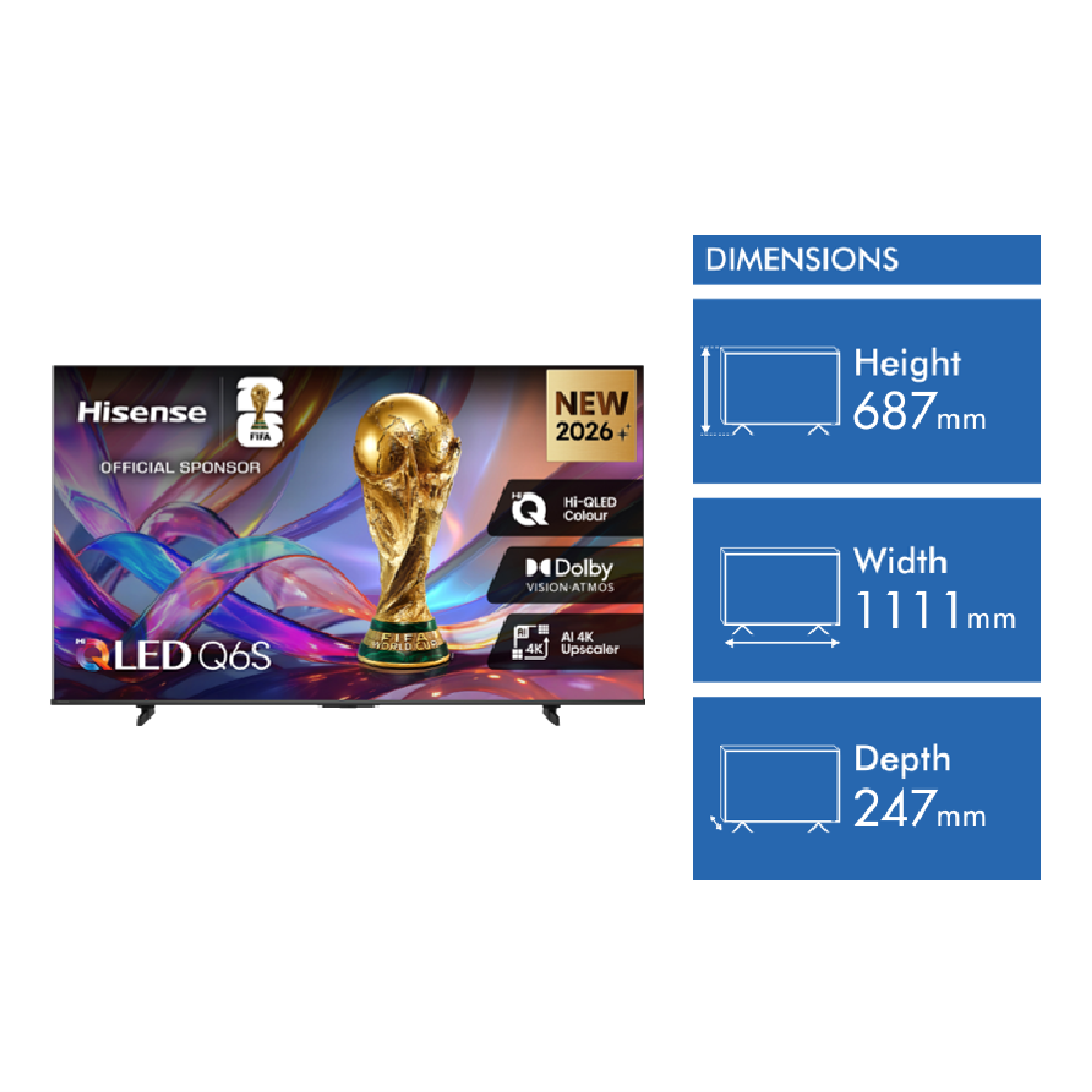 Looking for a TV that brings movies and shows to life in your lounge room? This 50 inch Q6SAU 4K Hi-QLED Smart TV uses LED technology and QLED colour to deliver crisp visuals and vibrant hues so every scene looks clear and detailed. The 4K resolution and HDR10 with Dolby Vision work together for sharp contrast and rich colour making your favourite content pop. You can stream Netflix YouTube and Prime Video easily thanks to VIDAA U9 smart features and voice assistant support. Dolby Atmos sound adds depth so you feel right in the middle of the action. With Bluetooth and wired connections setting up your soundbar or other devices is simple. Measuring 1111 millimetres wide and weighing just 7.7 kilograms with the stand this TV fits comfortably in most spaces. You get peace of mind with a three year manufacturer's warranty. Model 50Q6SAU. Ready to enjoy your next movie night?