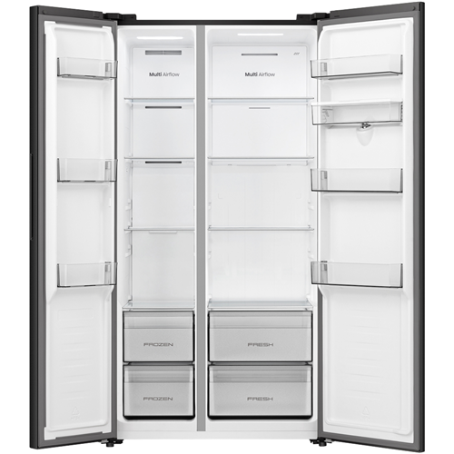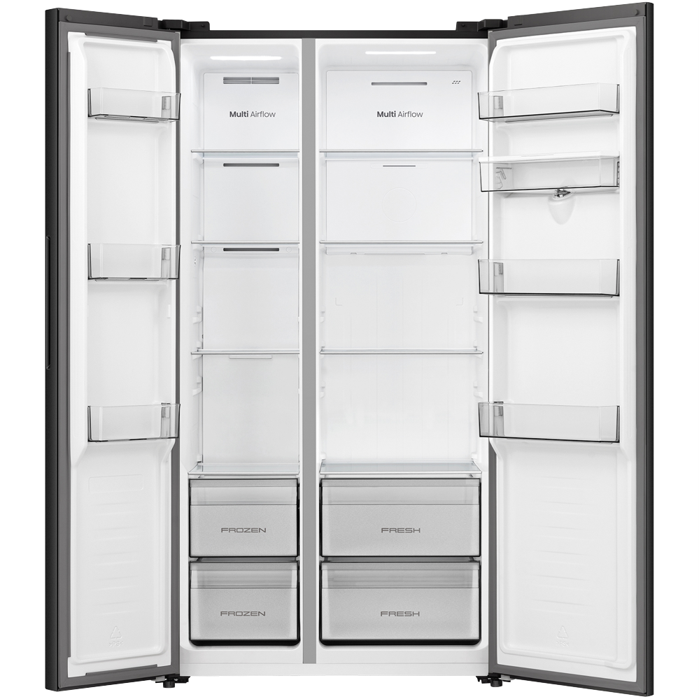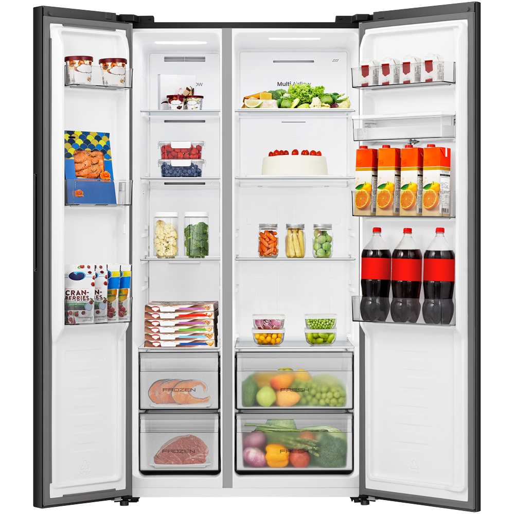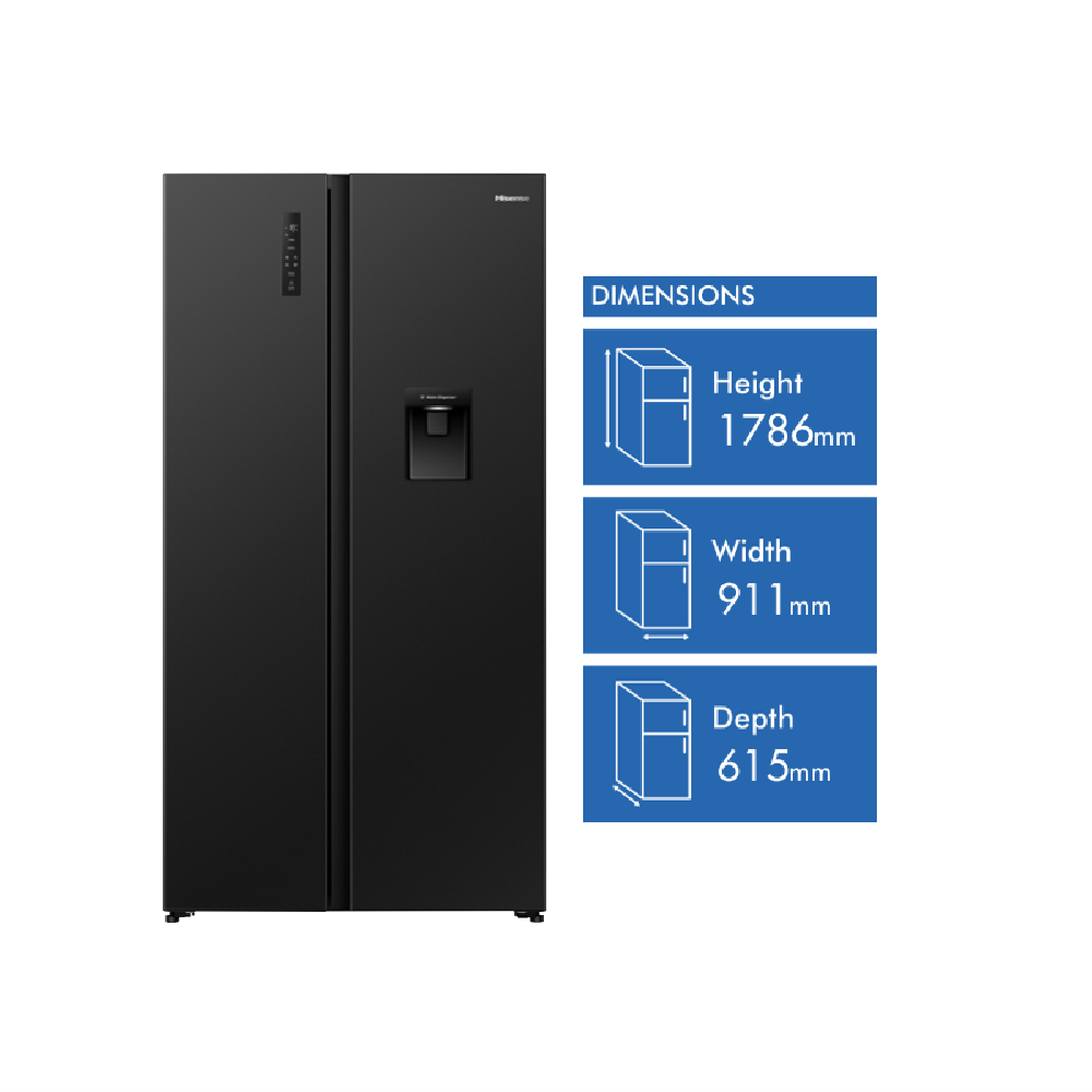 Looking for a fridge that keeps everything organised and easy to reach? This 541 litre side by side refrigerator from the Hisense PureFlat Collection offers loads of space for both fresh and frozen foods so you can store family favourites without fuss. With a sleek black PureFlat design electronic touch controls and soft LED lighting you'll find grabbing a snack or prepping dinner feels effortless. Multi airflow technology helps keep food fresher for longer while the water dispenser adds convenience on hot days. Adjustable shelves XXL door balcony and a big box compartment mean you can fit everything from tall bottles to bulky veggies. Plus inverter technology and a 4 star energy rating help keep running costs down. Measuring 1786 millimetres high 911 millimetres wide and 615 millimetres deep this fridge suits most kitchens and weighs 90 kilograms. Enjoy peace of mind with a three year manufacturer's warranty. Model HRSBS540BW. Take the next step towards a more organised kitchen.