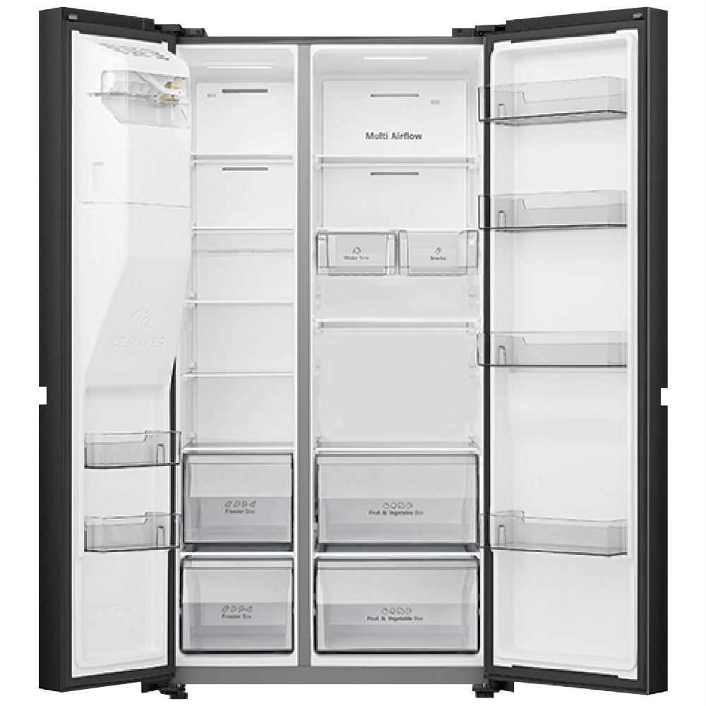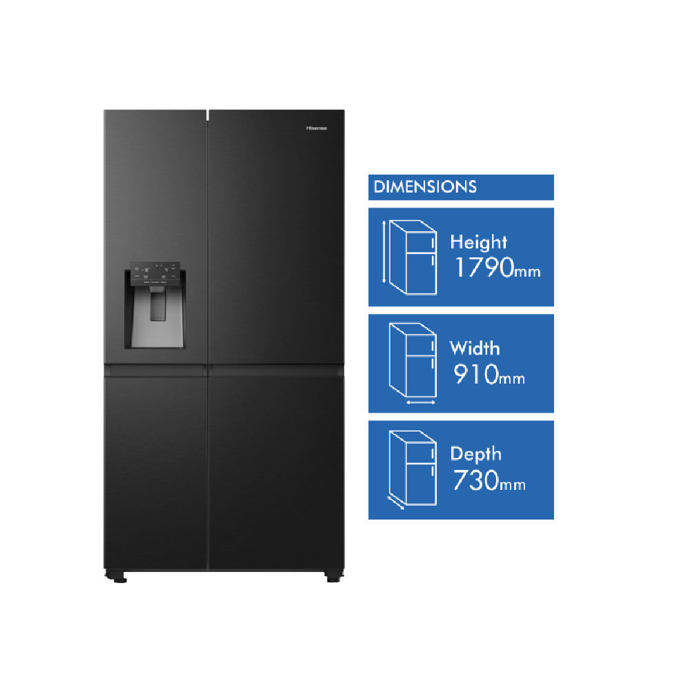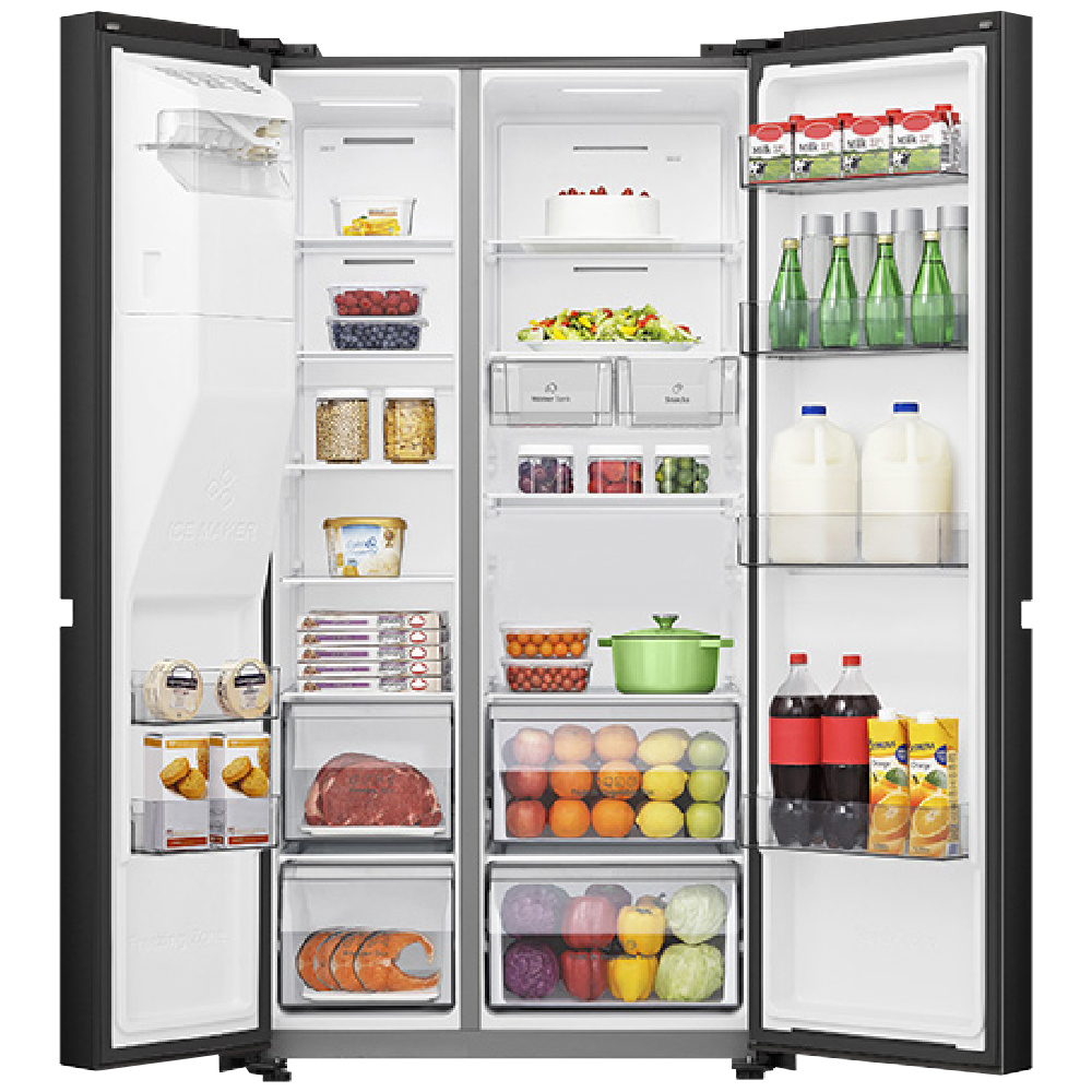 This spacious 632L side by side refrigerator gives you plenty of room for all your groceries with 417L of fridge space and 215L in the freezer. The convenient ice and water dispenser keeps your drinks cold and refreshing without needing plumbing thanks to its built-in water tank. Inside you'll find adjustable and fixed shelves for flexible storage while the big box compartment is perfect for bulky items. Super Freeze and Super Cool modes quickly chill new groceries and the soft LED lighting makes everything easy to find. Comes with a 3-year warranty. Model HRSBS633BW.