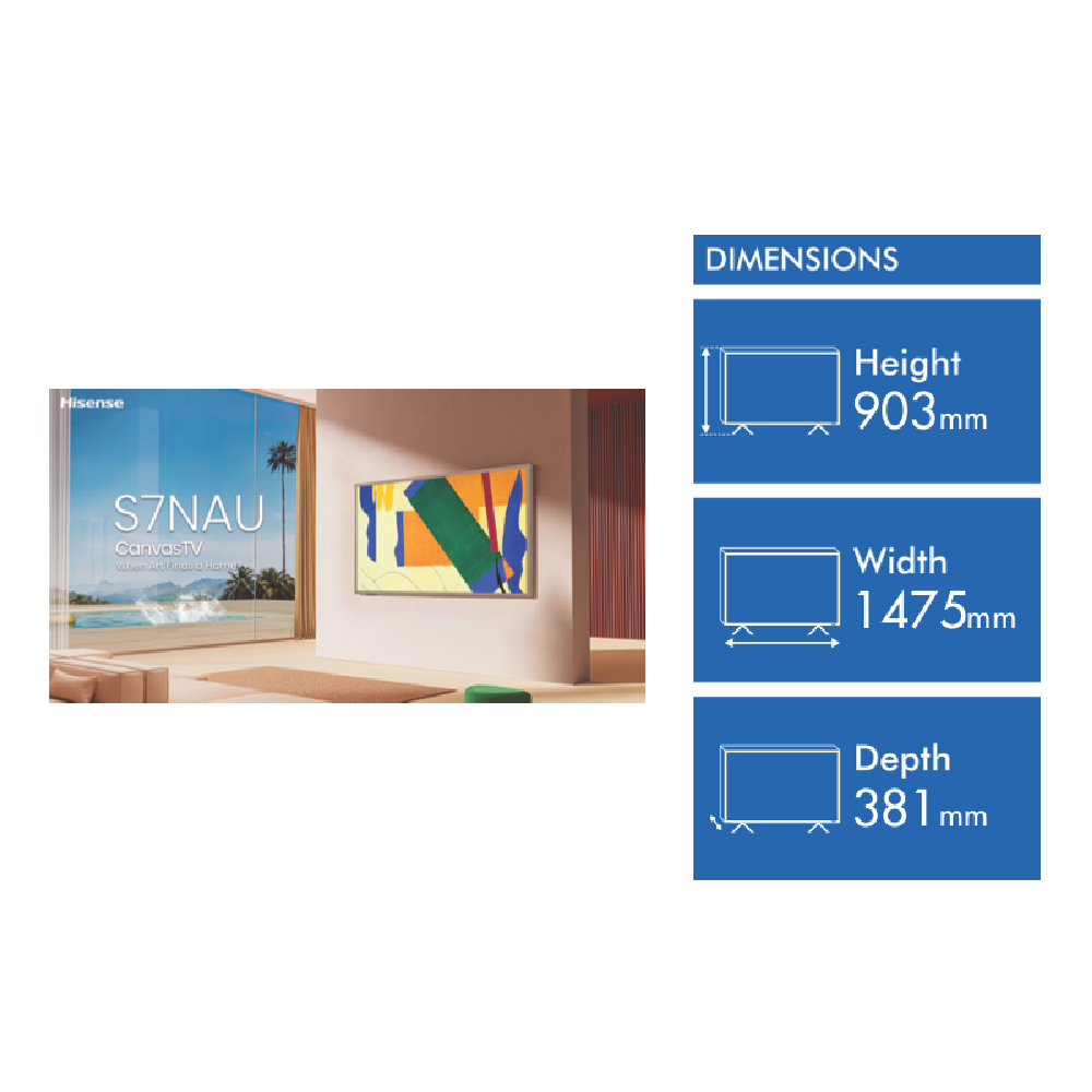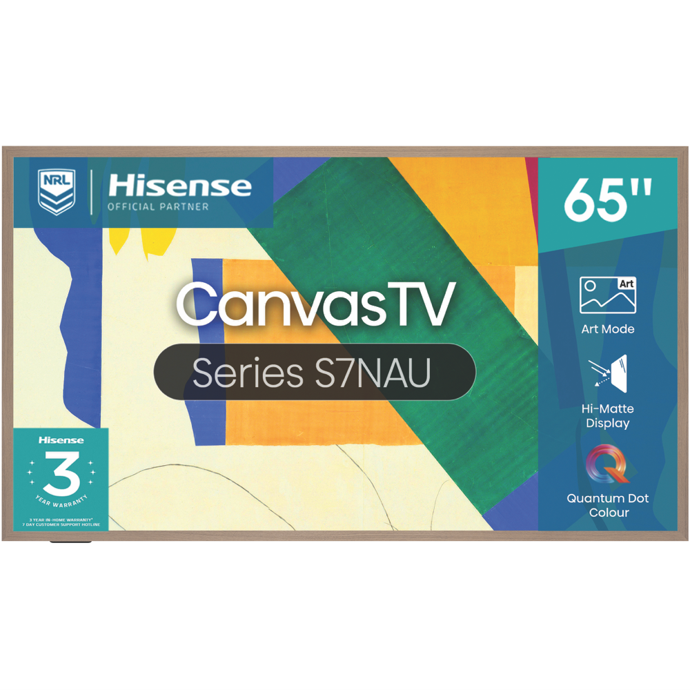Upgrade your viewing experience with the Hisense 65 Canvas S7NAU 4K QLED Smart TV. This 65-inch QLED TV boasts a stunning 3840 x 2160 resolution bringing your favorite shows and movies to life with vibrant 4K Quantum Dot Colour. Enjoy smooth action with a 144Hz refresh rate and 240 Motion Rate. The VIDAA U8 smart TV operating system puts a world of entertainment at your fingertips. Plus with Dolby Vision support and 2*10W speakers you'll enjoy immersive visuals and sound. Measuring 1629mm wide 1082mm high and 203mm deep this sleek TV is ready to be the centerpiece of your home theater setup. Model 65S7NAU comes with a 3-year manufacturer's warranty for added peace of mind.