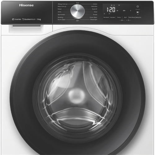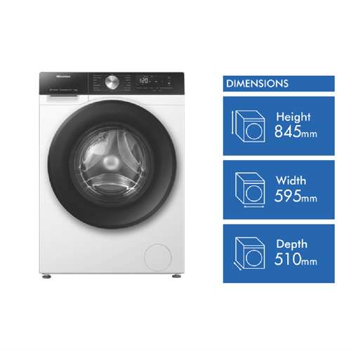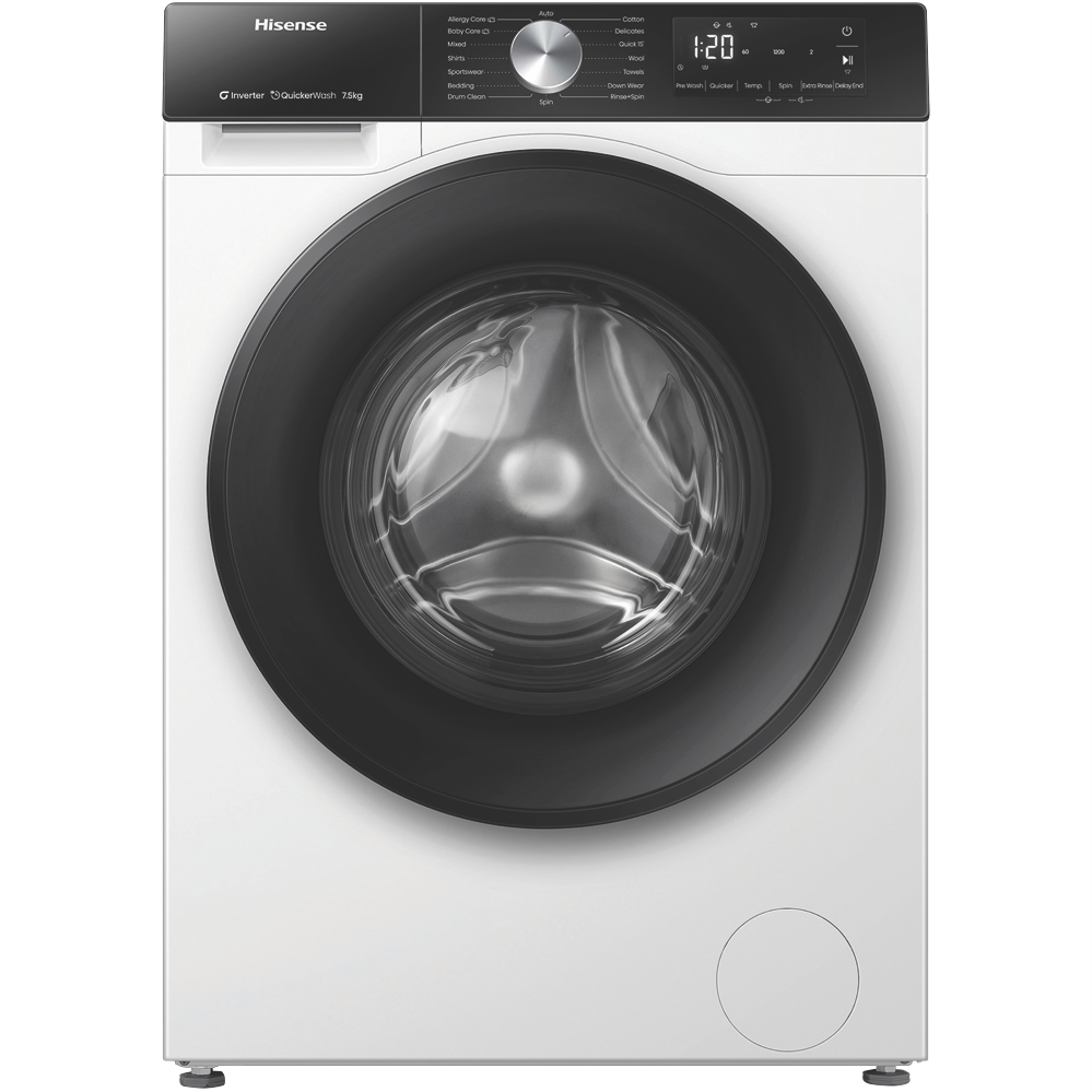 Experience effortless laundry days with the Hisense 7.5kg front load washing machine. This white washer offers an impressive 7.5kg washing capacity perfect for tackling loads of all sizes. With a maximum spin speed of 1400rpm your clothes will emerge thoroughly cleaned and efficiently spun. Boasting a 4.5 star water rating and using only 64 liters per wash on the Cotton 40C 1400rpm setting with Extra Rinse pressed 3 times this Hisense front loader is both water-efficient and environmentally friendly. The 4.5 star energy rating further emphasizes its commitment to energy conservation. Choose from 16 washing programs including Allergy Care Baby Care Sportswear Bedding Drum Clean and more tailoring each wash to your specific needs. Enjoy convenient features like Delayed End Steam Load Detection Pause to Add Quicker Function Prewash Extra Rinse and Jet Wash. With a product width of 595mm height of 845mm and depth of 510mm this washer fits seamlessly into your laundry space. Additional features include Auto Wash Cycle Child Lock Progress Indication Adjustable Feet End of Program Sound Alert Program Memory Backup Pause and Add Function and Steam Option. The manufacturer's part number for this product is HWFS7514S. Upgrade your laundry routine with the Hisense 7.5kg front load washer and enjoy the peace of mind that comes with a 3-year manufacturer's warranty.