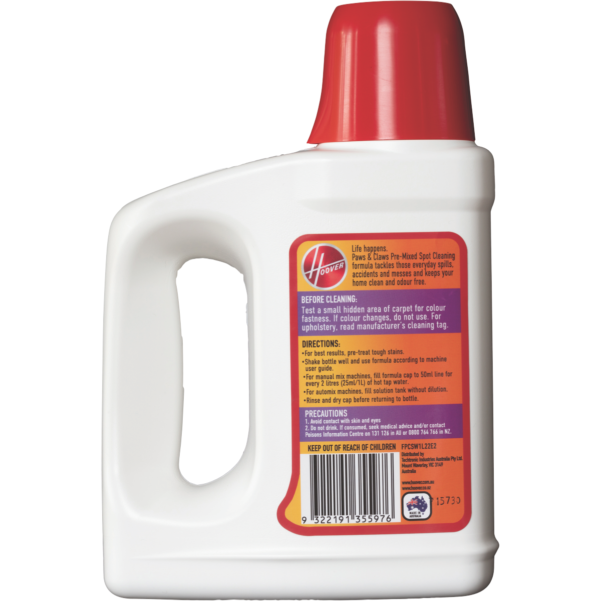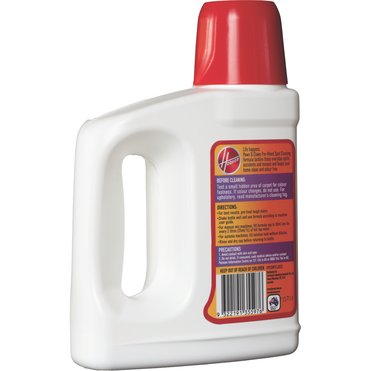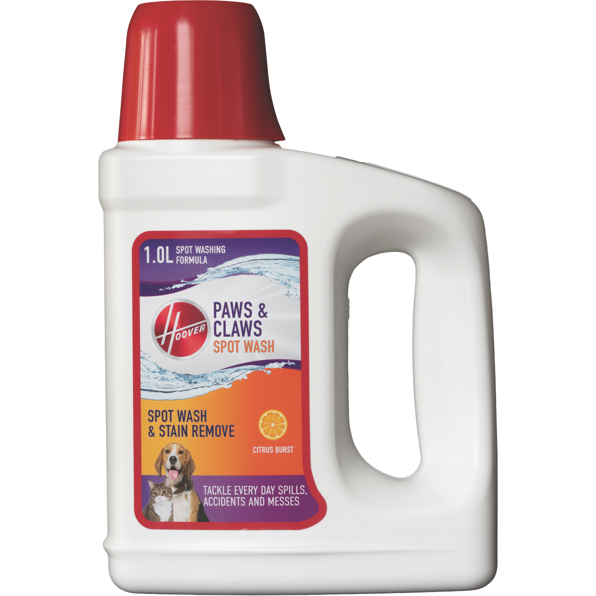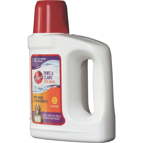 Hoover's Paws & Claws Spot Solution 1L FPCSW1L22E2 is a dedicated Spot Wash formula specially designed to work in Hoover Spot Wash machines. Have a bottle on hand to tackle everyday spills accidents and messes. Perfect for tackling stubborn stains or emergency spills on couches stairs and the car.