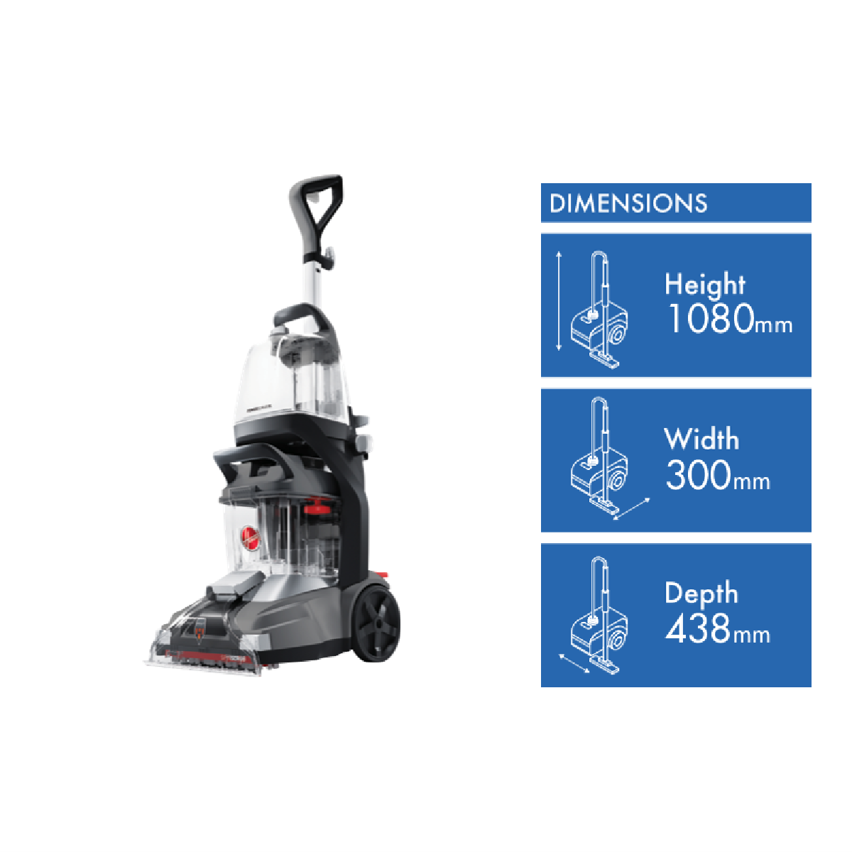 The Hoover PowerScrub XL Carpet Washer FACCW21T0K powerfully tackles deep set in stains and renews carpets for a complete whole home clean. Easily remove stains with the combined power of the five counter rotating SpinScrub brushes and faster drying via HeatForce technology. The TruMax recovery tank helps clean more without stopping frequently to empty and refill. Plus the Power Scrub XL comes with versatile tools to target stubborn messes beyond just carpets.