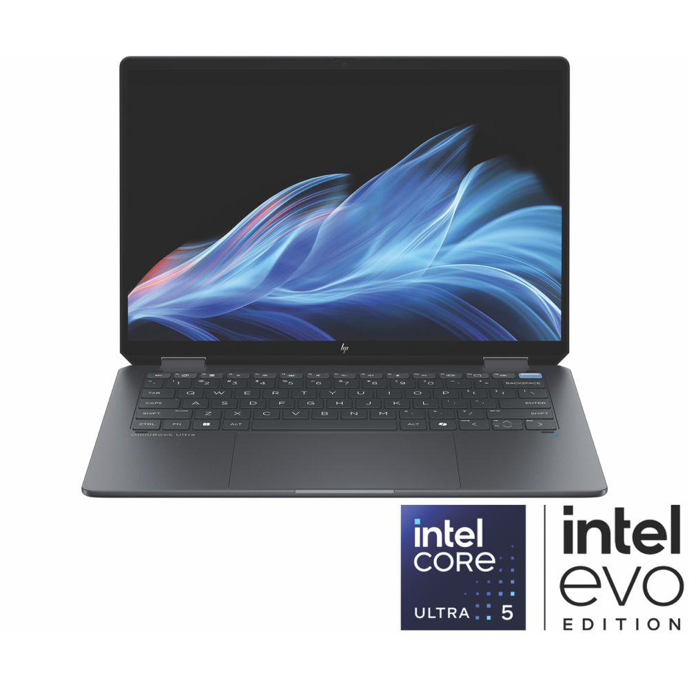 Introducing the HP Omnibook Ultra 14 2-in-1 laptop your perfect companion for work and play. With its sleek Eclipse Grey design this notebook packs a punch. The 14 OLED touchscreen boasts a stunning 2880x1800 resolution and 400 nits brightness bringing your content to life. Under the hood you'll find a powerful Intel Core Ultra 5 processor with 8 cores and up to 4.5 GHz speed paired with 16GB memory and Intel Arc graphics. The generous 1TB SSD provides ample storage for all your files. Stay connected with Wi-Fi 7 BE201 (2x2) USB Type-C and Thunderbolt 4 ports. The 9MP IR AI camera quad speakers with DTS:X Ultra and up to 21 hours of battery life round out this impressive package. Weighing just 1.35kg and measuring 216.25 x 313.7 x 14.9mm the HP Omnibook Ultra (AY6V3PA) is ready to keep up with your busy lifestyle. Plus enjoy peace of mind with a 12-month manufacturer's warranty.