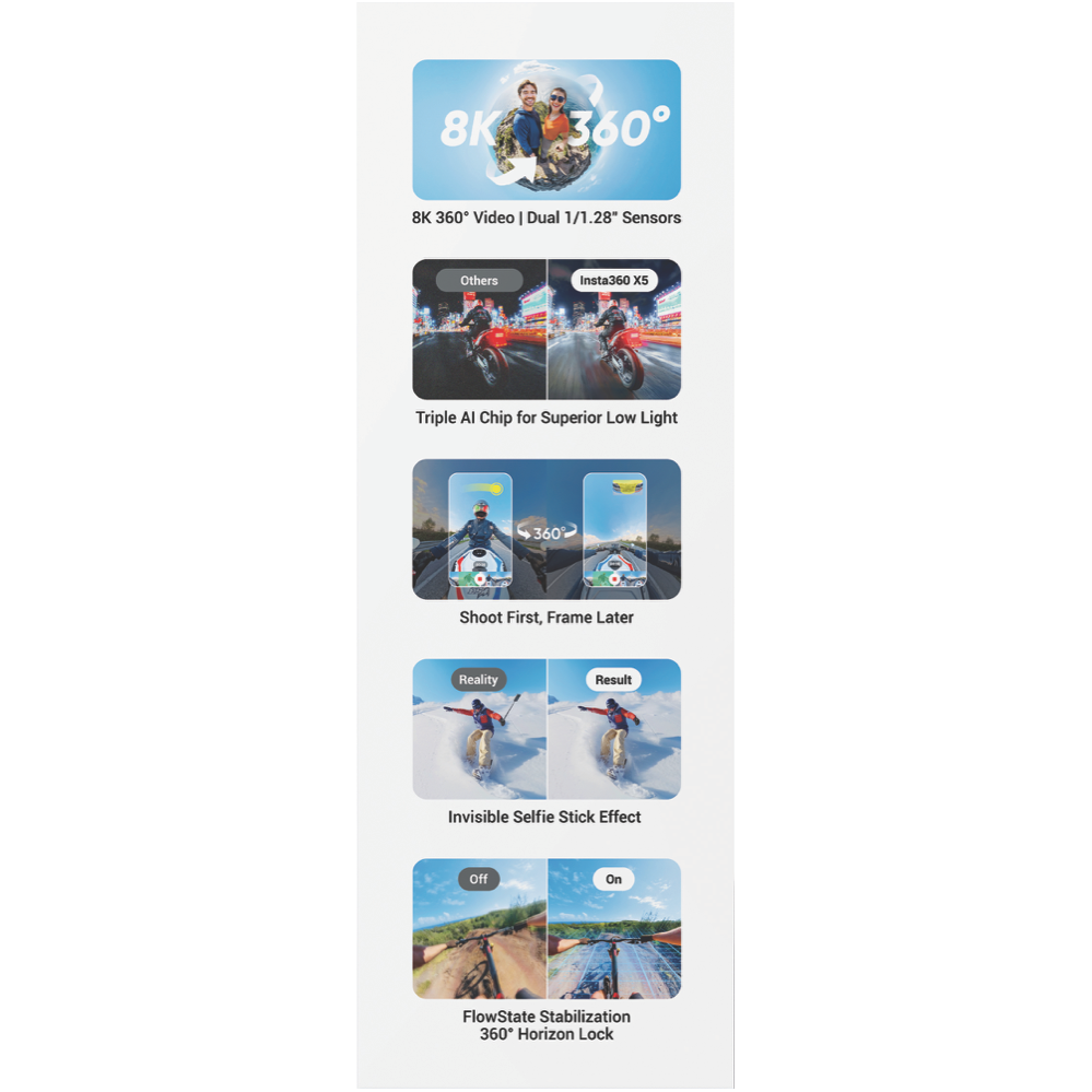 For the first time ever a 360° camera is paired with three AI chips for a 140% increase in overall computing power. Two dedicated Pro Imaging Chips enhance low light quality and reduce noise for cleaner images and a 5nm AI Chip offers powerful image processing faster image speed and improved quality. Combined with dedicated low light shooting mode PureVideo for advanced AI noise reduction and optimized dynamic range X5 delivers clear vivid footage no matter the lighting. Whether it's an evening ride or exploring the city after dark expect jaw-dropping quality in every frame.