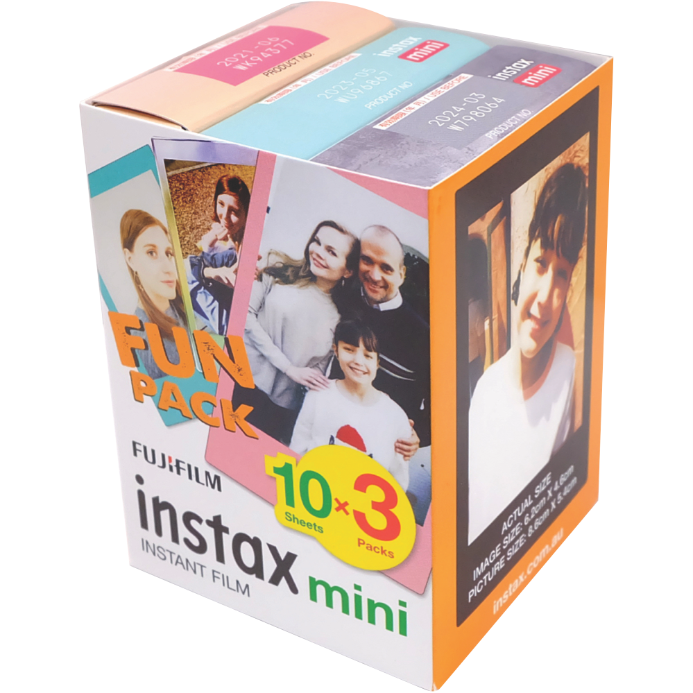 Get creative with this Mini Film Mix Fun 30pk for your instax mini camera or printer. Compatible with any instax mini device including the mini 12 mini 40 mini 90 and mini Link 2 this replacement film produces credit card-sized photos measuring 54 x 86mm. The pack includes 30 sheets giving you plenty of opportunities to capture and print your favorite moments. Model 85256.