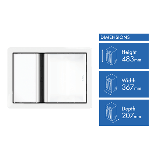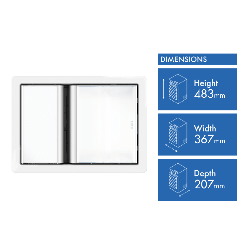 Transform your bathroom experience with the IXL Tastic Luminate Single 3 in 1 unit. This clever bathroom fixture combines a powerful heater exhaust fan and light in one compact white design. Measuring 482.75mm wide and 367mm deep it fits neatly into your ceiling while providing all the functionality you need. The exhaust fan efficiently clears steam and odours with its 480 m3/h capacity keeping your bathroom fresh and preventing mould growth. Backed by a comprehensive 5 year in-home warranty you can count on reliable performance for years to come. Model number: 31411.