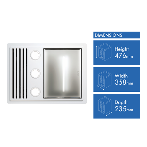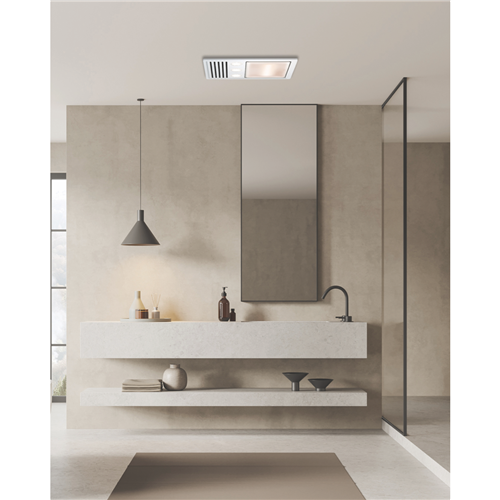 Recently honoured by The Australian Brand Awards 2021 the Tastic Ovation 3 in 1 Bathroom Heater Fan and Light has been recognized as an ABA100 Winner for Product Innovation.With a powerful centrifugal exhaust fan design Tastic Ovation 3 in 1 provides a strong airflow extraction up to 396m3/hr to eliminate steam instantly. Finished in a contemporary white fascia design with modern frosted 4000K cool white LED and 800W heat lamp with Halo Heat Technology Tastic Ovation brings luxurious warmth and instant brightness to your bathroom.Tastic Ovation is designed with a side ducted fan with inclined outlet for optimised ducting and easy installation. Each unit also includes a self-sealing back draught stopper that prevents draughts and insects entering the unit while not in use sealing warmth within your bathroom and protecting from unwanted airflow. Suitable for 5 Star Energy Rated Homes*. Ideal for medium sized bathrooms. Tastic Ovation is compliant with NCC in Australia and G4 Building Codes and Healthy Home Standard for bathrooms and kitchens in New Zealand.Tastic Ovation is proudly designed and manfactured in Australia.* Where exhausting into the roof is allowed.