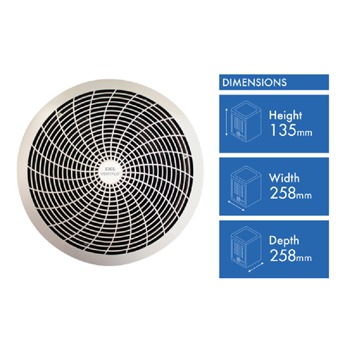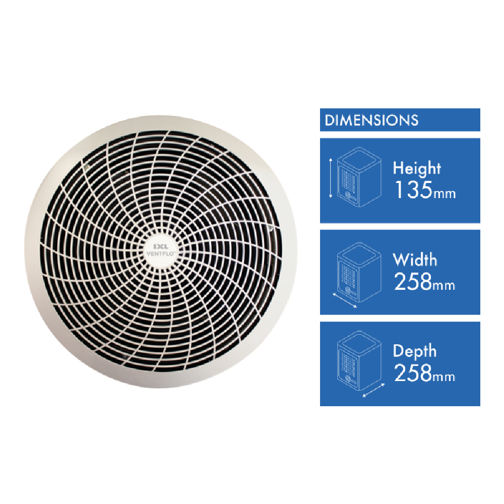Keep your bathroom fresh and dry with this powerful IXL Ventflo Extraction Fan. The 250mm fan quietly removes moisture at just 33 decibels about as quiet as a whisper while its impressive 627m /h extraction capacity tackles steam quickly after hot showers. Finished in clean white to blend with most bathroom ceilings this exhaust fan measures 358mm wide by 151mm high making installation straightforward. The practical design includes a dishwasher-safe fascia for easy cleaning and it comes with cord and plug for simple setup. Backed by a 2 year replacement warranty this bathroom fan provides reliable performance for everyday use. Model number: 10331.