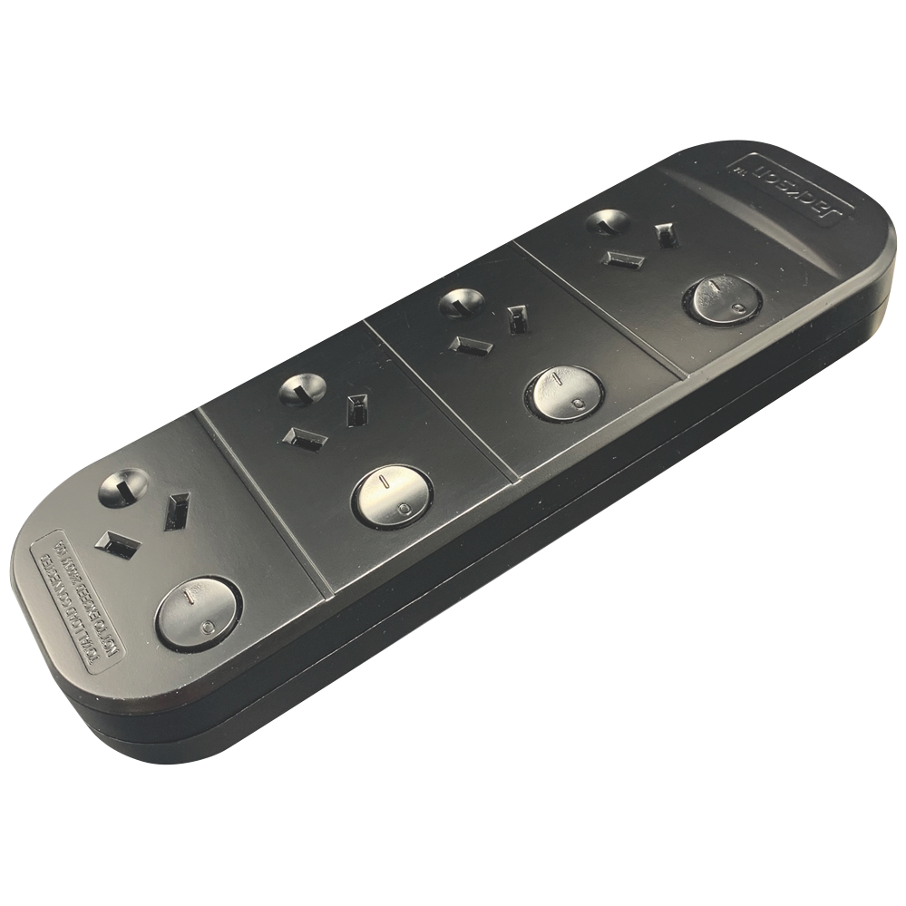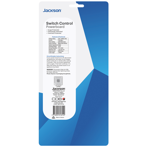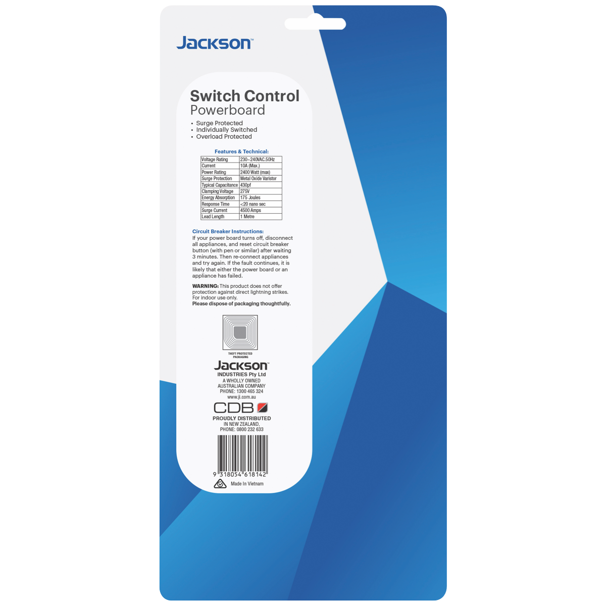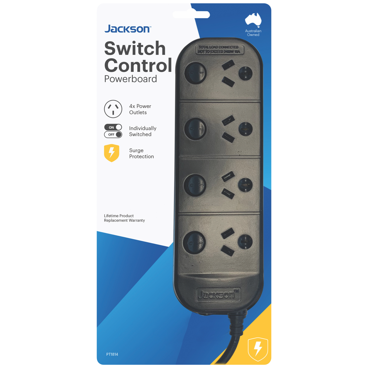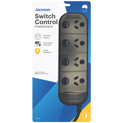 Take control of your power with the Jackson 4 Way Individual Switch Powerboard. This surge protected powerboard allows you to independently switch four outlets on and off making it easy to completely shut off power to individual devices and reduce phantom power draw. With a sleek black design and 1 metre lead it provides both functionality and flexibility. Use the individual switches to cut power to appliances not in use saving you money on your power bill over time. The four widely spaced outlets let you plug in chunky transformers without blocking adjacent sockets. Surge protection provides peace of mind by guarding your precious electronics from power spikes. So if you want to reduce standby power waste and gain finer control over your devices the Jackson 4 Way Powerboard is the smart choice. Rest assured too because this powerboard is backed by Jackson's lifetime warranty. The manufacturer's part number for this product is PT1814. Give your power supply an upgrade with the Jackson 4 Way Individual Switch Powerboard today.