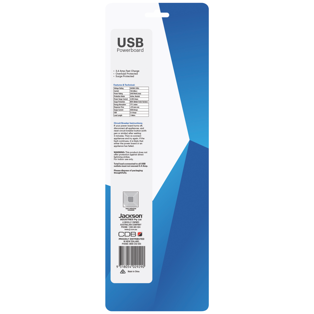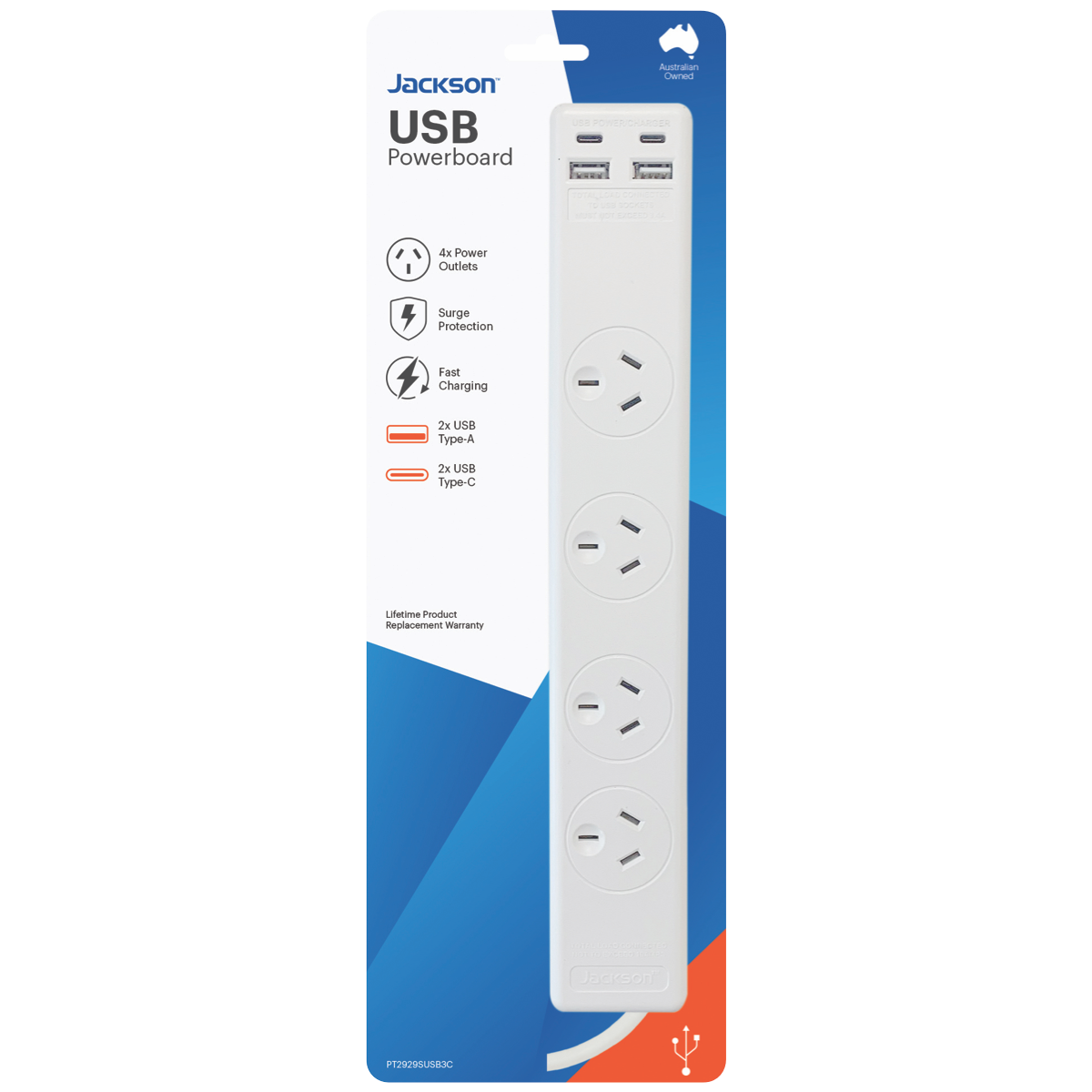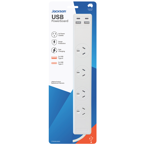 The Jackson 4 Way Surgeboard with 2x USB and 2x USB-C Ports is a must-have power solution for any modern home or office. With 4 spaced outlets for bulky adaptors and a 1 metre lead with an easy pull plug it provides versatile power connectivity. The built-in surge protection safeguards your devices while the 2 USB and 2 USB-C ports allow convenient charging of phones tablets and more. Stay powered up without clutter thanks to the right angle plug design. With a lifetime manufacturer's warranty you can power your essentials with confidence and peace of mind. This surgeboard's smart design and essential features make it the perfect addition to your workspace or entertainment setup. Convenient reliable power is within reach. The manufacturer's part number for this product is PT2929SUSB3C. Discover the versatile power connectivity you need today.