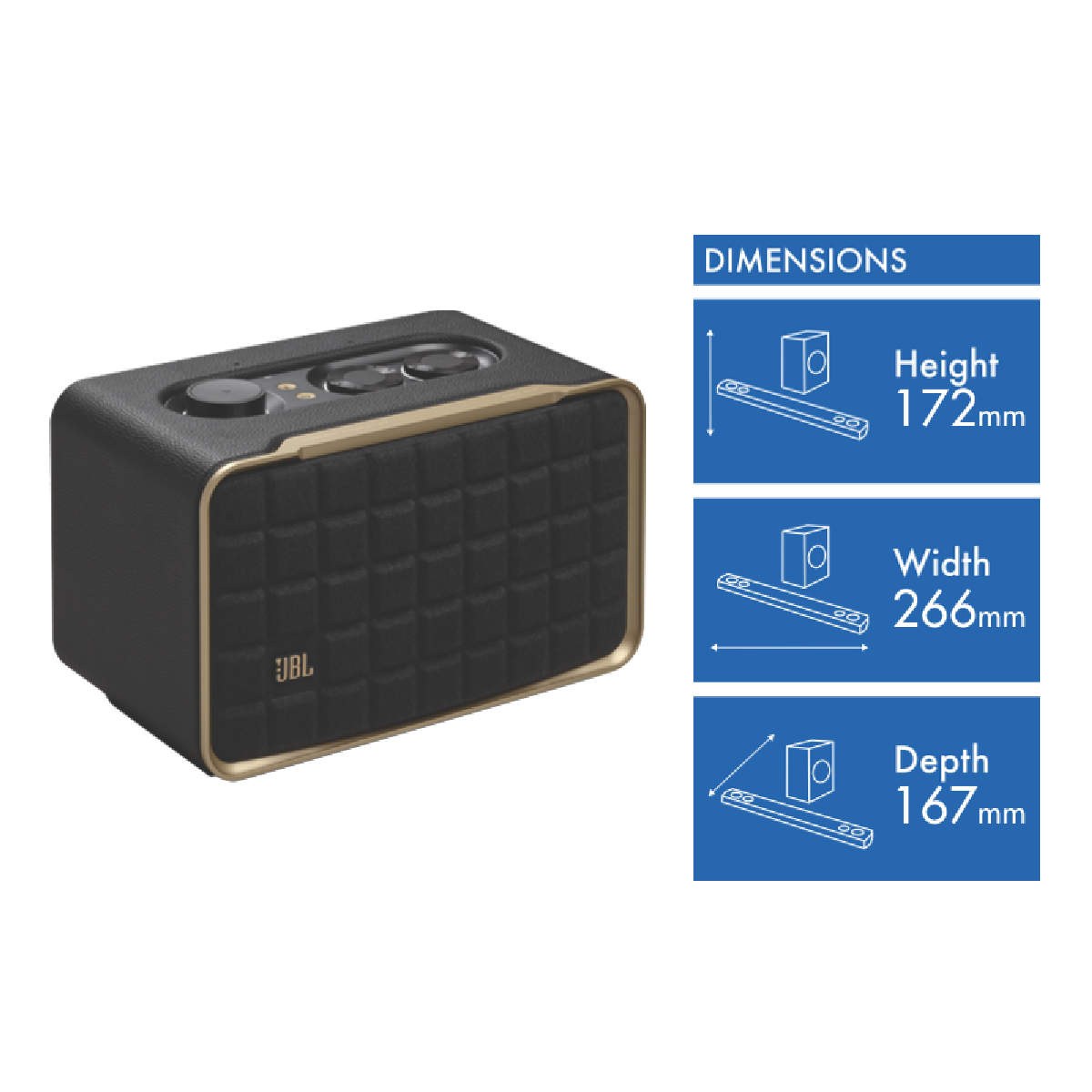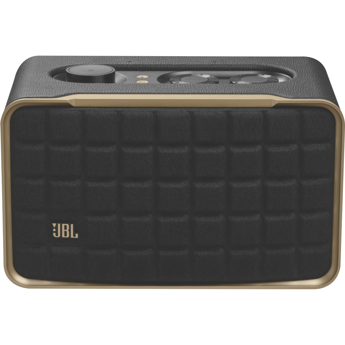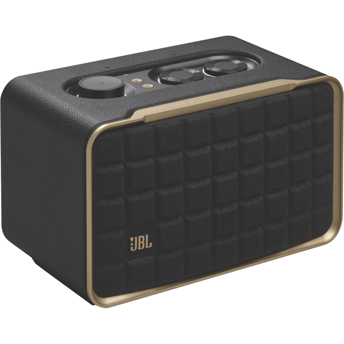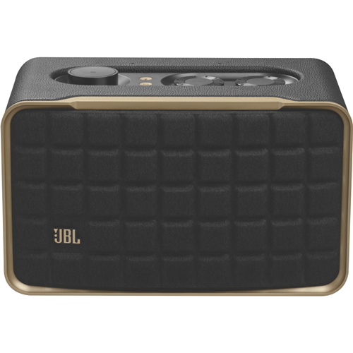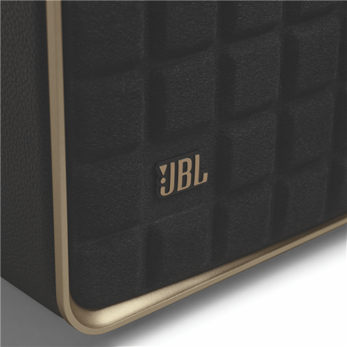 Additional Features Aluminium frame and custom leather enclosure give it a retro appeal, Features intuitive controls and the JBL One App (download required), so you can easily customise its settings
