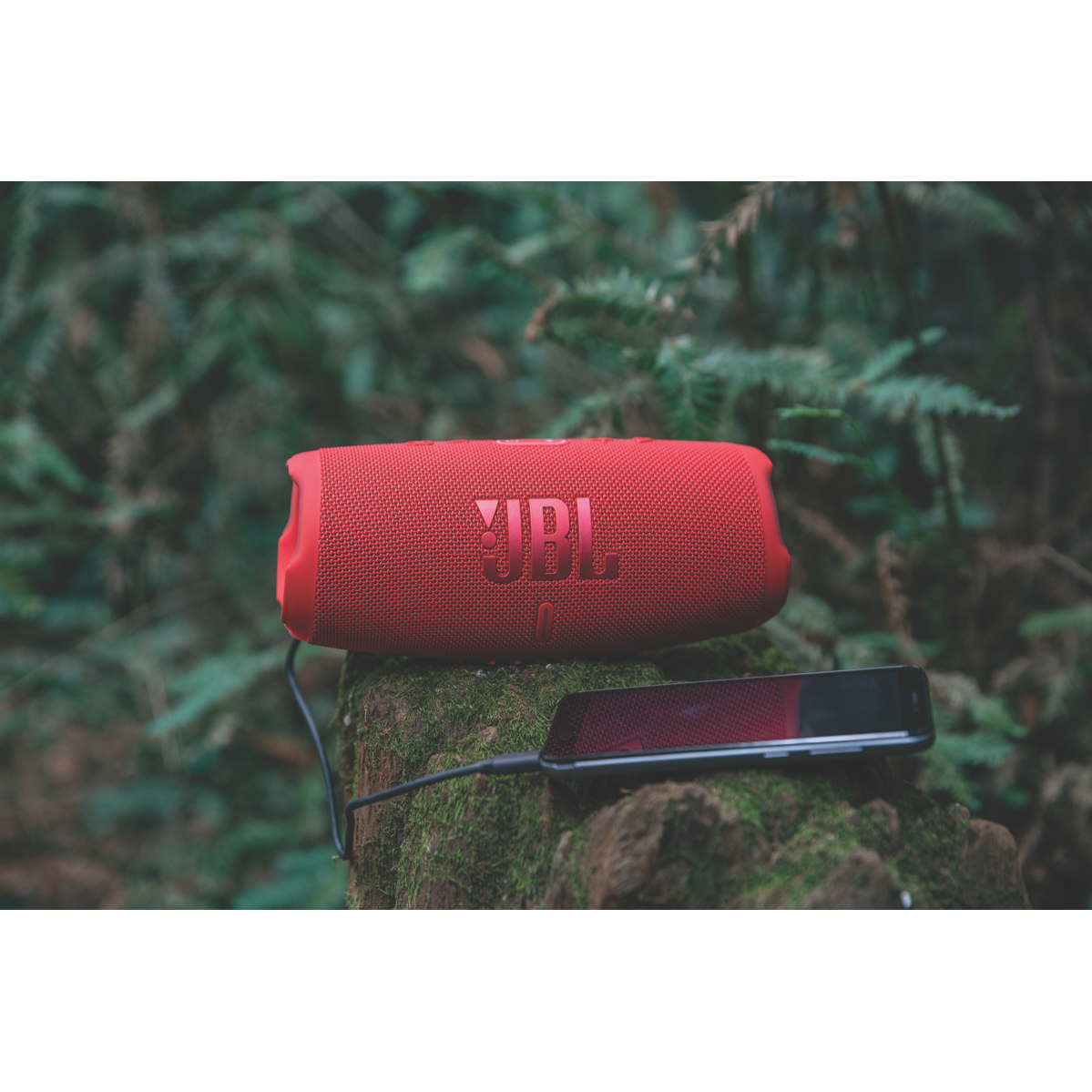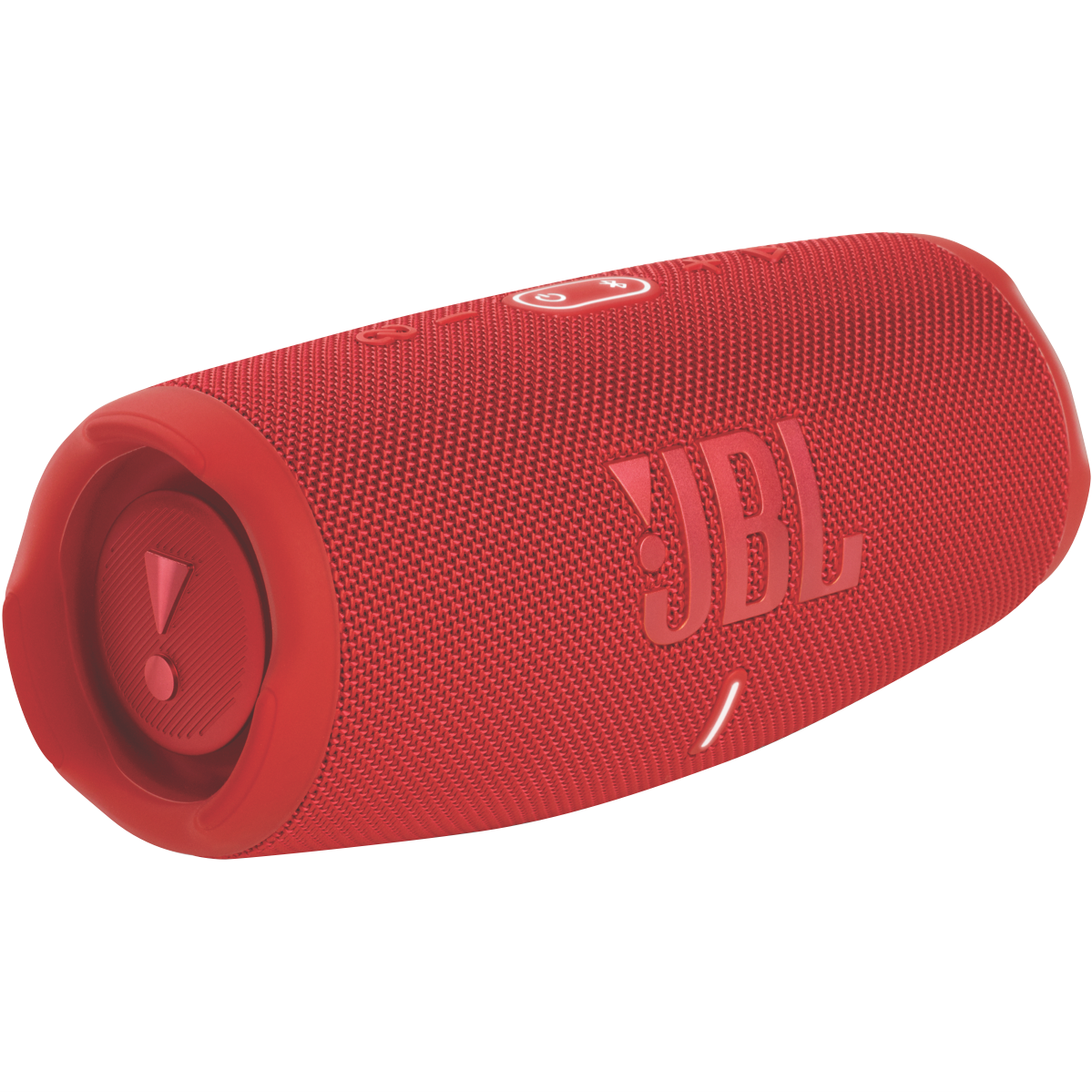 Make a bold statement with the JBL Charge 5 Portable Bluetooth Speaker in vibrant red. This portable speaker pumps out powerful punchy sound with 30W of total output power. Its optimized long excursion driver and separate tweeter deliver clear highs and deep bass you can feel for immersive listening. Bluetooth 5.1 provides cable-free music streaming from your smartphone tablet or laptop. You can also wirelessly connect two separate devices at once and take turns playing DJ. With an IP67 waterproof and dustproof rating you can bring your speaker anywhere without worry - poolside parties beach adventures camping trips you name it. The built-in powerbank lets you charge your devices without interrupting the music. Enjoy up to 20 hours of playtime per charge for all-day entertainment. Compact durable and travel-ready the JBL Charge 5 brings bold dynamic audio and cool style in a grab-and-go design. Visualize vibrant tunes and robust bass filling your next backyard BBQ or road trip soundtrack with this JBL portable Bluetooth speaker. The manufacturer's part number for this product is 5083982. Take your music anywhere with the JBL Charge 5.