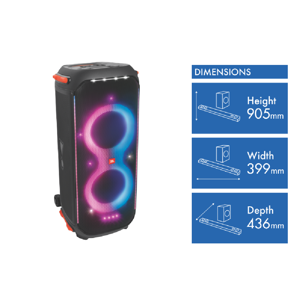 Get ready to pump up the volume with the JBL Partybox 710 Speaker. This powerhouse delivers 800W of sound through its woofer and tweeter system bringing the party to life with JBL's signature pro sound. It's not just about the music - it's about the experience. You can pair multiple speakers for an even bigger sound perfect for those outdoor gatherings or indoor dance parties. And don't worry about lugging it around - the easy-to-grip handle and robust wheels make it a breeze to move. For the aspiring DJs and musicians there are guitar and mic inputs to showcase your talents. The Bluetooth 5.1 connectivity lets you stream tunes wirelessly while the aux-in port gives you more options. Standing at 905mm tall and weighing 27.80kg this party starter is built to impress. The JBL Partybox 710 (model number JBLPARTYBOX710AM) comes with a 1-year warranty so you can party with peace of mind.