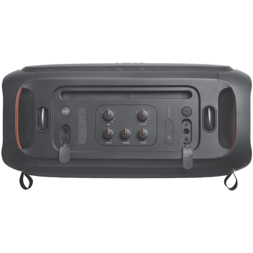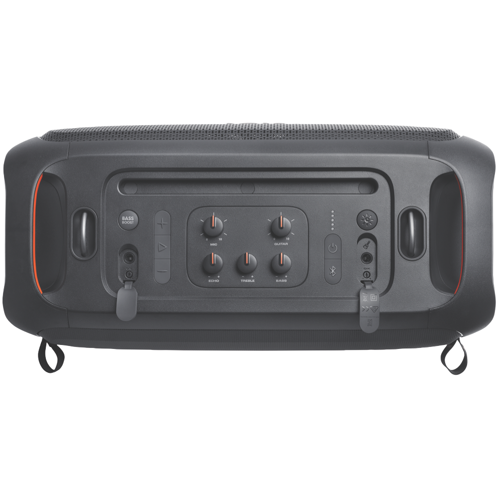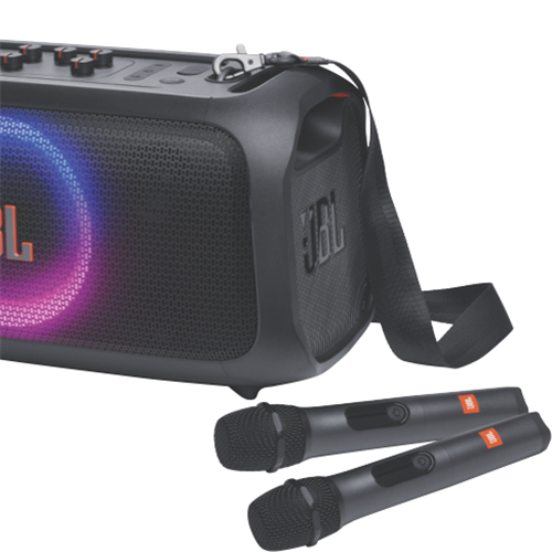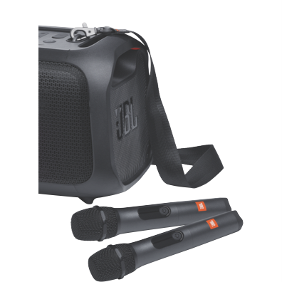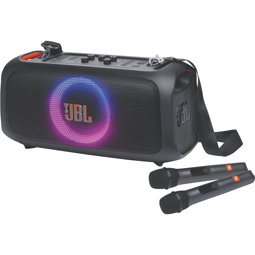 The JBL PartyBox On-The-Go Essential lets you see hear and feel the beat. Turn it up loud with 100 watts of powerful JBL Pro Sound synched to a dazzling light show. Access your favourite tunes with Bluetooth USB AUX and TWS (True Wireless Stereo) connectivity grab a friend and sing your hearts out with the JBL wireless mics or use the guitar input to play along. With a bottle opener padded shoulder strap rechargeable battery and IPX4 splashproof protection the JBL PartyBox On-The-Go Essential has everything you need to get the party started and take it with you