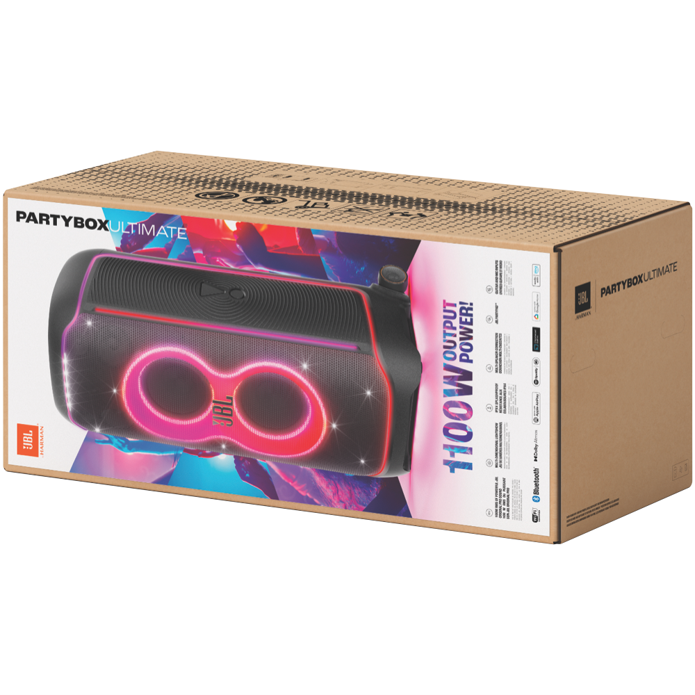 Get ready to turn up the volume with this JBL party speaker. It's a big one standing over a meter tall and weighing nearly 40 kg but that means it's packed with power. You can stream music from your phone or tablet using Bluetooth or WiFi. It handles deep bass notes down to 30 Hz and clear highs up to 20 kHz so your tunes will sound great. Don't worry about splashes - it's got an IPX4 rating to handle some water. Perfect for backyard parties or indoor dance sessions. Just plug it in connect your device and let the good times roll. The JBL Partybox Ultimate (model 6357376) comes with a 1-year warranty for peace of mind.