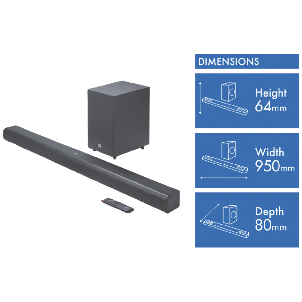 Listen up this JBL SB550 soundbar is ready to rock your world. With 250 watts of power across 3.1 channels you'll feel every beat and hear every detail. It's got Bluetooth 5.3 so you can stream all your favorite tunes wirelessly. The wireless subwoofer brings the bass while the HDMI ARC and optical inputs make setup a breeze. Plus it comes with a remote all the cables you need and even a wall-mount kit. At just 64mm tall and 2.5kg it'll fit right into your space without any fuss. JBL backs it with a 1-year warranty too. Ready to upgrade your sound? The JBL SB550 (6254239) is waiting for you.