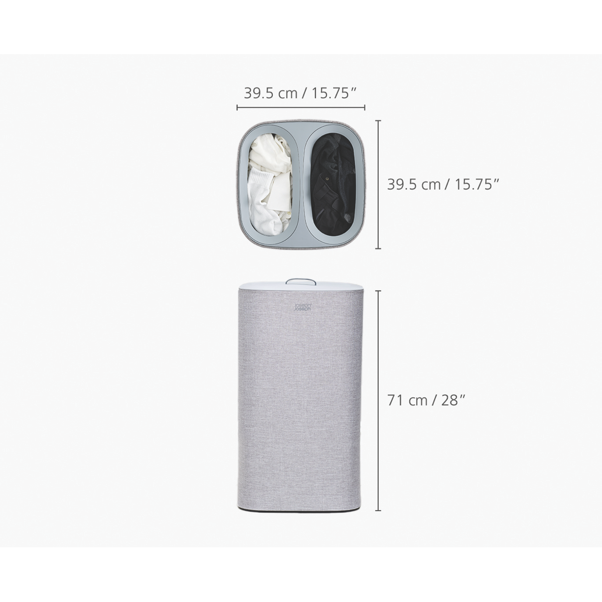 The Joseph Joseph Tota 60 Litre Laundry Separation Basket Grey is the perfect solution for easily sorting your laundry. This dual compartment basket features two 30-litre removable tote bags with easy-carry handles that make transporting your laundry a breeze. The self-locating bags neatly fit back into the main basket for fast and fuss-free storage. With a helper handle on the base of each bag emptying laundry is effortless. This innovative basket is ideal for bedrooms bathrooms or utility rooms and comes flat-packed with full assembly instructions for quick and easy setup. Offering a generous 60 litres of combined capacity this basket simplifies laundry separation so you can efficiently wash delicates whites colours and more. The durable polypropylene construction ensures this laundry basket is built to last while the sleek grey colourway blends seamlessly into any home. Measuring 71cm high by 39.5cm wide by 39.5cm deep the compact Joseph Joseph Tota Laundry Basket is perfect for small spaces. Streamline laundry sorting and transport with this cleverly designed dual compartment basket.The manufacturer's part number for this product is 50001. Shop now and transform your laundry routine with the Joseph Joseph Tota 60 Litre Laundry Separation Basket.