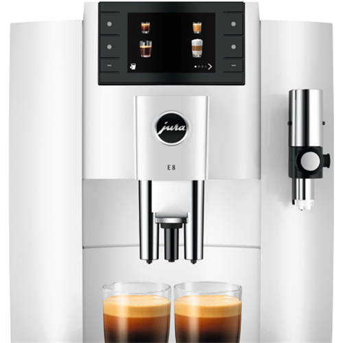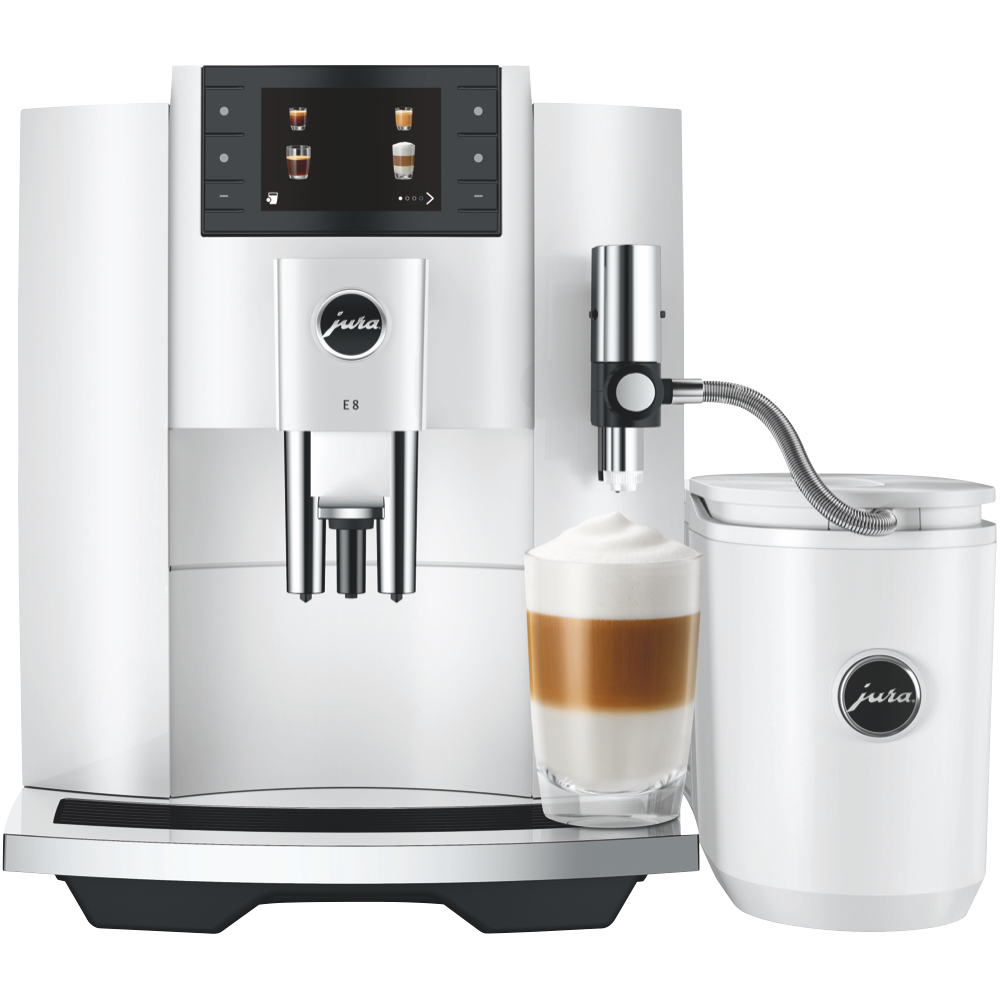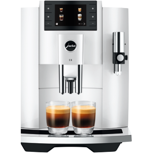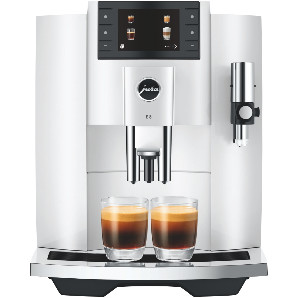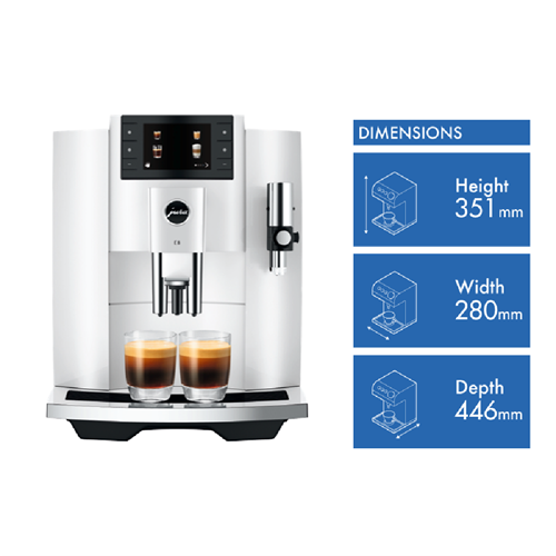 Discover the ultimate coffee experience with the JURA E8 INTC Piano White Coffee Machine. With intelligent preheating and precise 15 bar pump pressure this automatic coffee machine delivers barista-quality specialty coffees with ease. Its sleek piano white design houses advanced 3D brewing technology for full flavor extraction. Choose from 17 delicious coffee creations at the touch of a button. The built-in conical burr grinder with Pulse Extraction Process optimizes each cup while WiFi connectivity allows for convenient control via your smartphone. The 1.9L water tank and full-color display ensure minimal refills and effortless operation. With a height of 351mm depth of 446mm and width of 280mm this 10kg coffee machine fits perfectly on your countertop. Savor café-style coffee drinks in the comfort of home every morning. The manufacturer's part number for this product is 15662. Consider the JURA E8 for a sophisticated coffee experience.