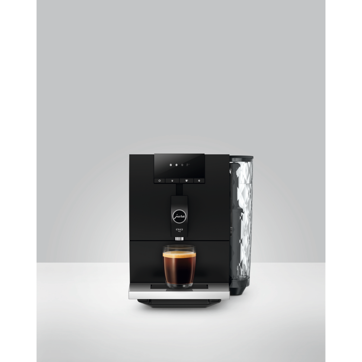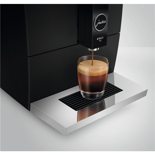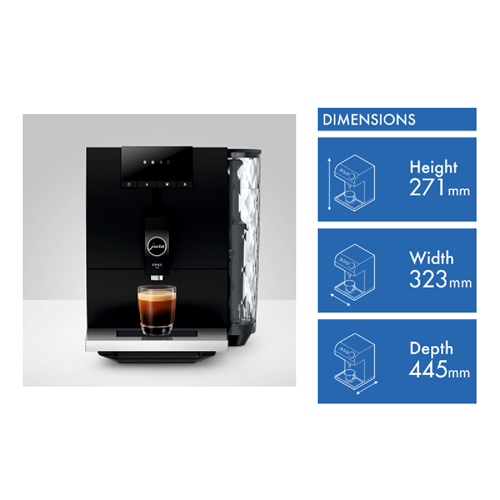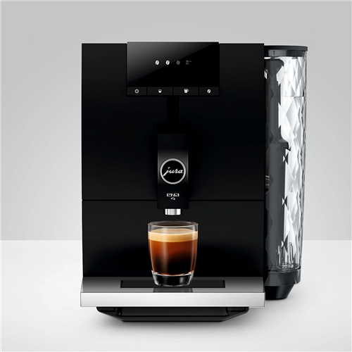 Wake up to café-quality coffee with the JURA ENA 4 Full Metropolitan Coffee Machine. This sleek automatic coffee machine brings the coffee house into your home with its 15 bar pump pressure and multi-level Aroma G3 grinder allowing you to freshly grind beans and extract optimal flavor. With a 1.1L water tank capacity and intelligent preheating you can brew cup after cup with no downtime. Choose from 3 coffee strengths and 4 speciality coffees like latte macchiato at the touch of a button. The height-adjustable spout thermoblock heating system and auto shut off provide added convenience. Connect via WiFi to control your machine remotely. The integrated CLARIS filter and cleaning programs make maintenance easy. With a contemporary metropolitan black finish this compact coffee machine adds style to your kitchen. The manufacturer's part number for this product is 15607. Bring café inspiration to your daily coffee routine with the JURA ENA 4.