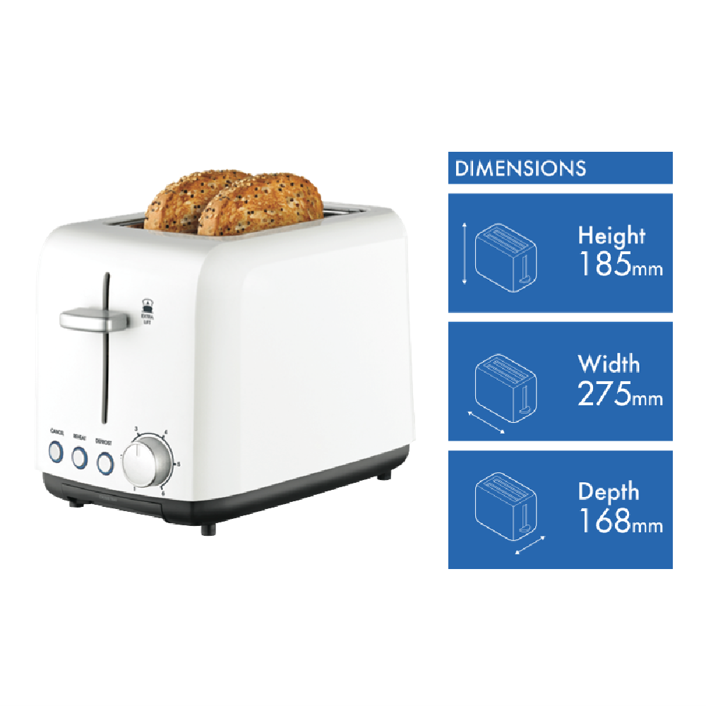 Start your morning right with the Kambrook 2 Slice Cool Touch Toaster. This 900W toaster features self-centring slots to perfectly align your bread English muffins or bagels for even browning every time. With variable browning control you can toast to your preferred level - from light golden brown to dark crisp. The cool touch exterior stays cool to the touch for safety. The high lift lever lets you easily remove smaller items without burning your fingers. Other convenient features include a removable crumb tray for quick cleanups cord storage to reduce clutter and non-slip feet for stability.Crafted from durable plastic in a stylish white finish this toaster blends into any modern kitchen decor. The Kambrook toaster offers toast customization with functions like defrost reheat and cancel. Toast bread waffles or pastries for the whole family with the spacious 2 slice capacity. Measuring 185mm high x 275mm wide x 168mm deep and weighing just 1.9kg this toaster is compact enough for small countertops. Give your mornings an easy breakfast upgrade with the Kambrook 2 Slice Cool Touch Toaster. The manufacturer's part number for this product is KTA120WHT. Check out this quality toaster today.