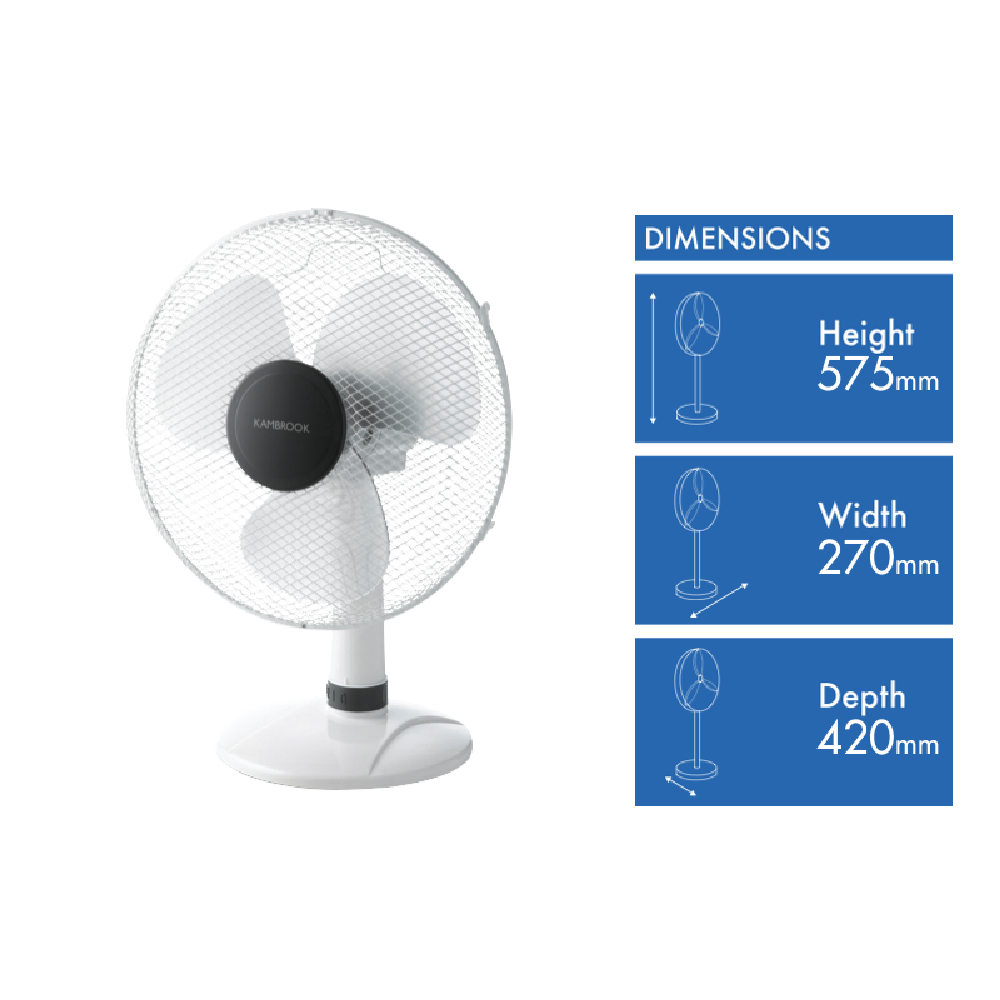 Keep cool and comfortable with the Kambrook 40cm Arctic Desktop Fan. This white desktop fan features a 40cm blade diameter and 80 degree oscillation to circulate air throughout your room. With 3 speed settings you can customize airflow for maximum comfort. Measuring 270mm wide 575mm high and 420mm deep its compact size is ideal for desks countertops and other flat surfaces. The manufacturer's part number for this product is KFA213. Check out this desktop fan for high-performance cooling you can count on.