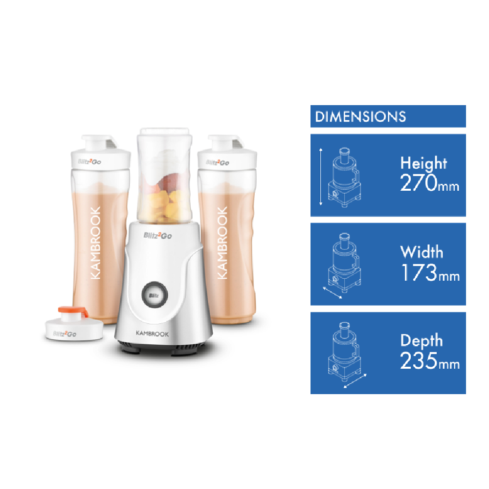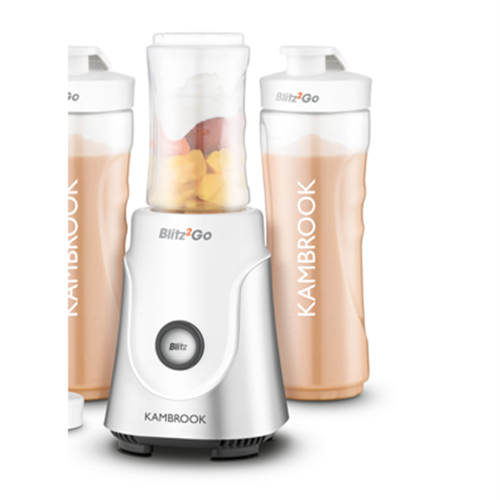 Take your morning smoothie on the go with the Kambrook Blitz2Go Active personal blender. This compact yet powerful 300W blender lets you blend and drink directly from the large 600ml cup. The stainless steel blades pulverize fruits veggies nuts and ice into a delicious smoothie in seconds. With no complicated settings or buttons simply twist on the lid to blend. The sleek silver design looks great on any kitchen counter. Blend drink and go - it's that easy. The Kambrook Blitz2Go Active makes it simple to start your day with a nutritious blended drink. The manufacturer's part number for this product is KBL63SIL. Check out this convenient personal blender today.