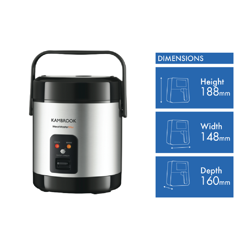 Conveniently cook a variety of dishes with the Kambrook MEAL MASTER MINI multicooker. This stainless steel compact kitchen appliance features a 215W motor and a non-stick aluminium cooking bowl perfect for whipping up quick tasty meals. With simple one touch operation you can use the Cook and Keep Warm settings to prepare rice porridge stews soups and more. The auto keep warm function ensures your food stays ready to eat. This multicooker makes 1.5 cups of fluffy rice and includes a measuring scoop and serving spoon. The removable power cord and cool touch handles allow for easy cleaning and storage. Portable and versatile the Kambrook MEAL MASTER MINI lets you cook delicious food at home or on the go. At 148mm wide 188mm high and 160mm deep it fits nicely on countertops without taking up too much space. With a 1 year warranty this quality multicooker will be your new go-to for easy convenient home cooking. The manufacturer's part number for this product is KRC300BSS2JAN1. Take your kitchen skills to the next level with the Kambrook MEAL MASTER MINI.