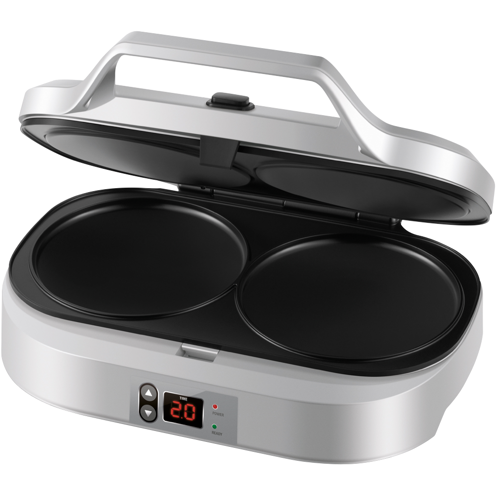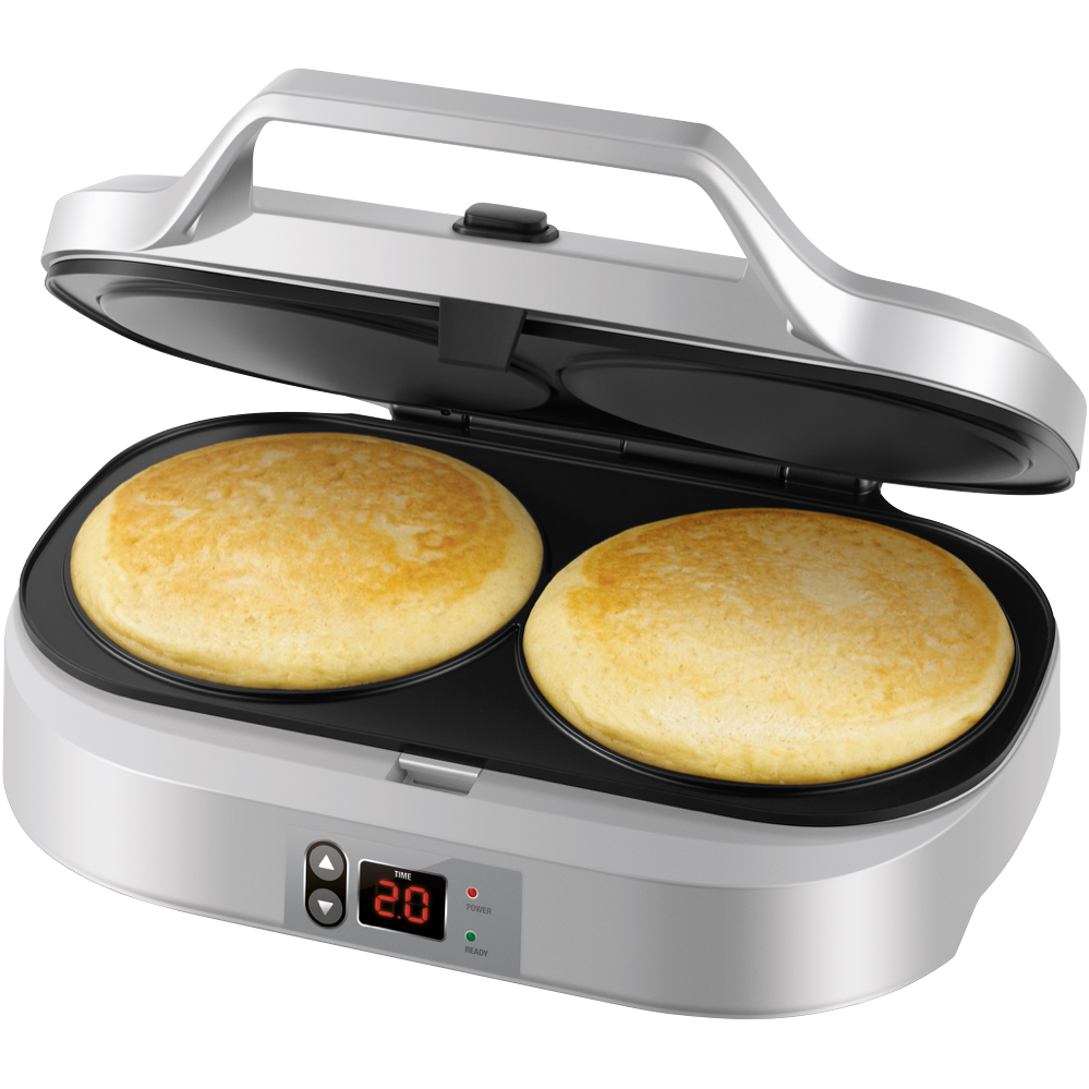 • Cooks two large golden fluffy pancakes to perfection in less than 2 minutes