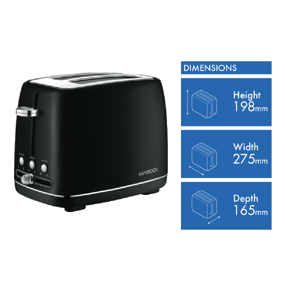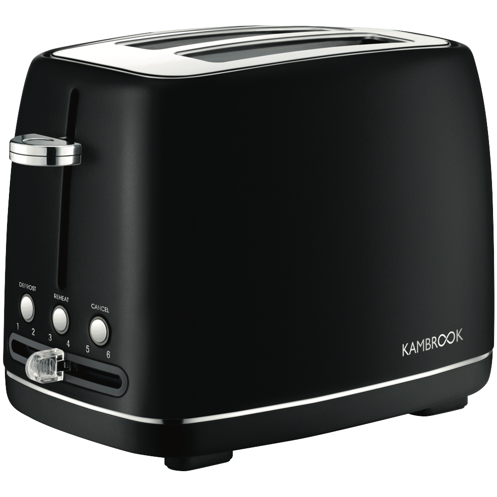 The Kambrook Perfect Slice 2 Slice Toaster (KTA270MTB) offers six browning settings allowing you and your family to create perfect slices of toast regardless of your differing preferences. The manual lever and self-centring slots ensure your bread is placed evenly in front of the heating elements every time. High lift functionality allows you to grab your cooked toast with ease while a push of the cancel button releases your toast before it cooks more than you d like. The Kambrook Perfect Slice toaster features a defrost button so you can take your bread from the freezer and easily defrost it for sandwiches or a snack. It also comes with a crumb tray and cord storage to help keep your bench or cupboard tidy.