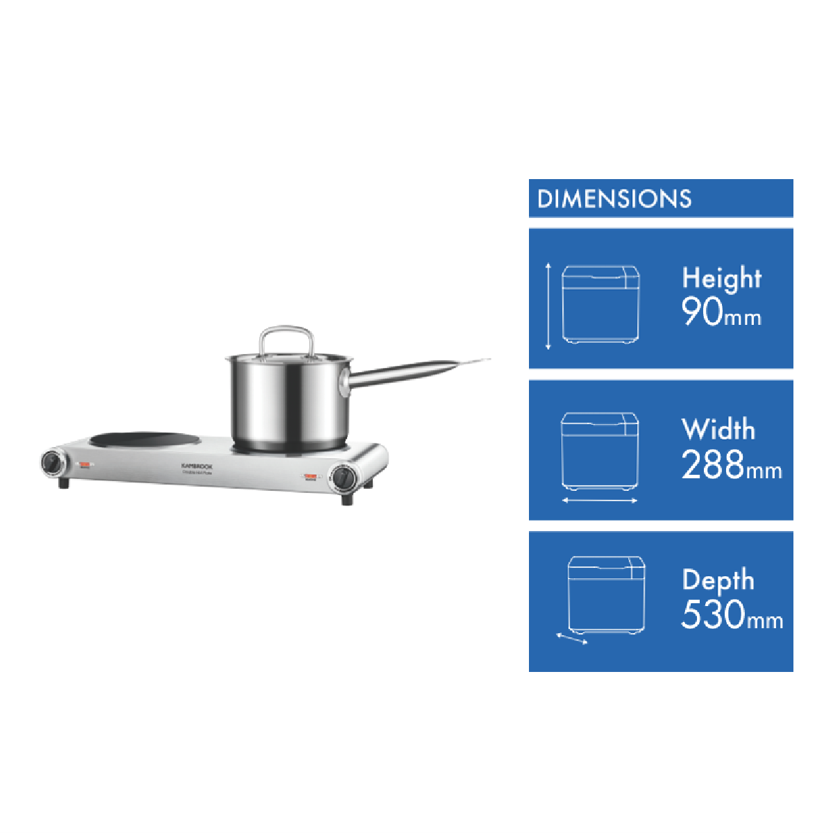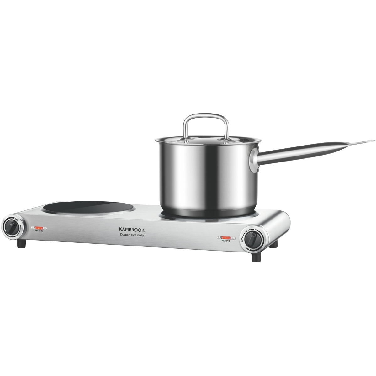 Take care of all your cooking needs with the Kambrook Portable Double Ceramic Hotplate. This versatile kitchen appliance features dual 1200W ceramic glass hot plates that heat up fast and distribute heat evenly for perfect cooking results every time. The 18cm plates give you ample room to cook for the whole family. With thermostat control dials you can easily adjust the temperature from low to high for everything from simmering sauces to searing steaks. The stainless steel body not only looks sleek in any kitchen but it is built to last. Rubber feet keep the hotplate firmly in place during use. A cord wrap allows for tidy storage in between cooking. With thermal fuse protection and a 1 year warranty you can cook with confidence on this high quality portable hotplate. The manufacturer's part number for this product is KHP120BSS2JAN1. See for yourself how convenient the Kambrook Double Ceramic Hotplate can be - order today.