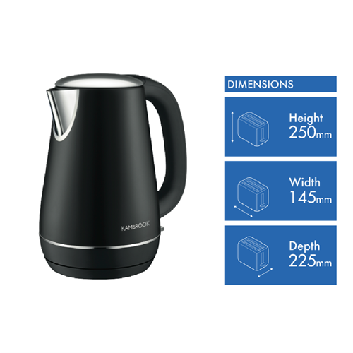 The Kambrook Purely Perfect 1.7L BPA Free Kettle (KKE630MTB) houses a seven-cup capacity making it easy to brew a single cup of tea or boil enough water to keep the whole family satisfied.The one touch pop up lid makes filling and emptying this kettle a breeze while the water level window ensures you can easily see if it needs re-filling. The concealed element provides a stylish look and ensures little fingers are safe from harm. The Kambrook Purely Perfect is cord-free and features boil dry protection auto off functionality and a removable and washable filter to help reduce impurities.