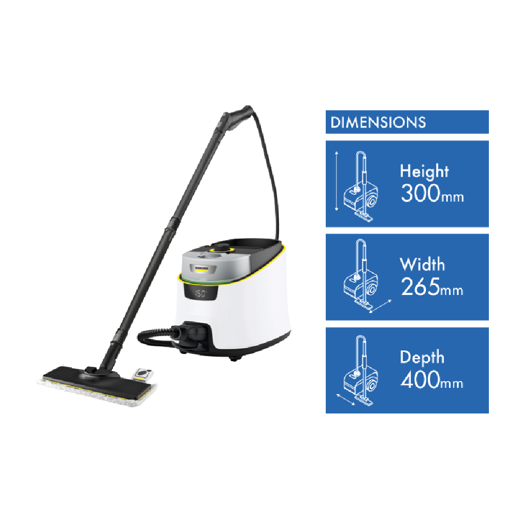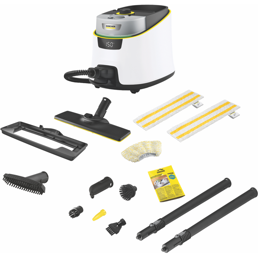 The new SC 5 Deluxe Signature Line: with the signature of technology pioneer and company founder Alfred Kärcher is recognisable at a glance as the best Kärcher device in its category. Thanks to the real-time LED display you can see how quickly the device is ready for use and enjoy easy storage with the accessory compartment. High-end functions such as the steam output can be adjusted to the surface and degree of soiling. OurVapoHydro function enables hot water to be selected in addition to the steam ensure real WOW moments even during cleaning.Disclaimers: (1)Through spot cleaning using the Kärcher steam cleaner i.e. steaming for 30 seconds on the maximum steam setting in direct contact with the surface to be cleaned 99.999% of enveloped viruses such as influenza viruses (except the hepatitis B virus) can be eliminated on most smooth hard surfaces in the house (test germ: modified vaccinia Ankara virus).(2)When cleaning at a cleaning speed of 30 cm/s using the maximum steam setting and with direct contact with the surface to be cleaned 99.99% of all common household bacteria on common smooth hard household surfaces are killed (test germs: Enterococcus hirae).
