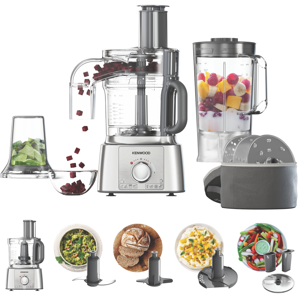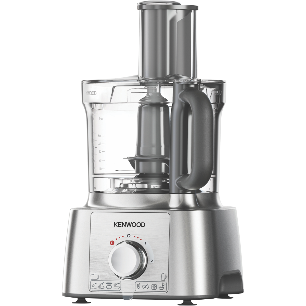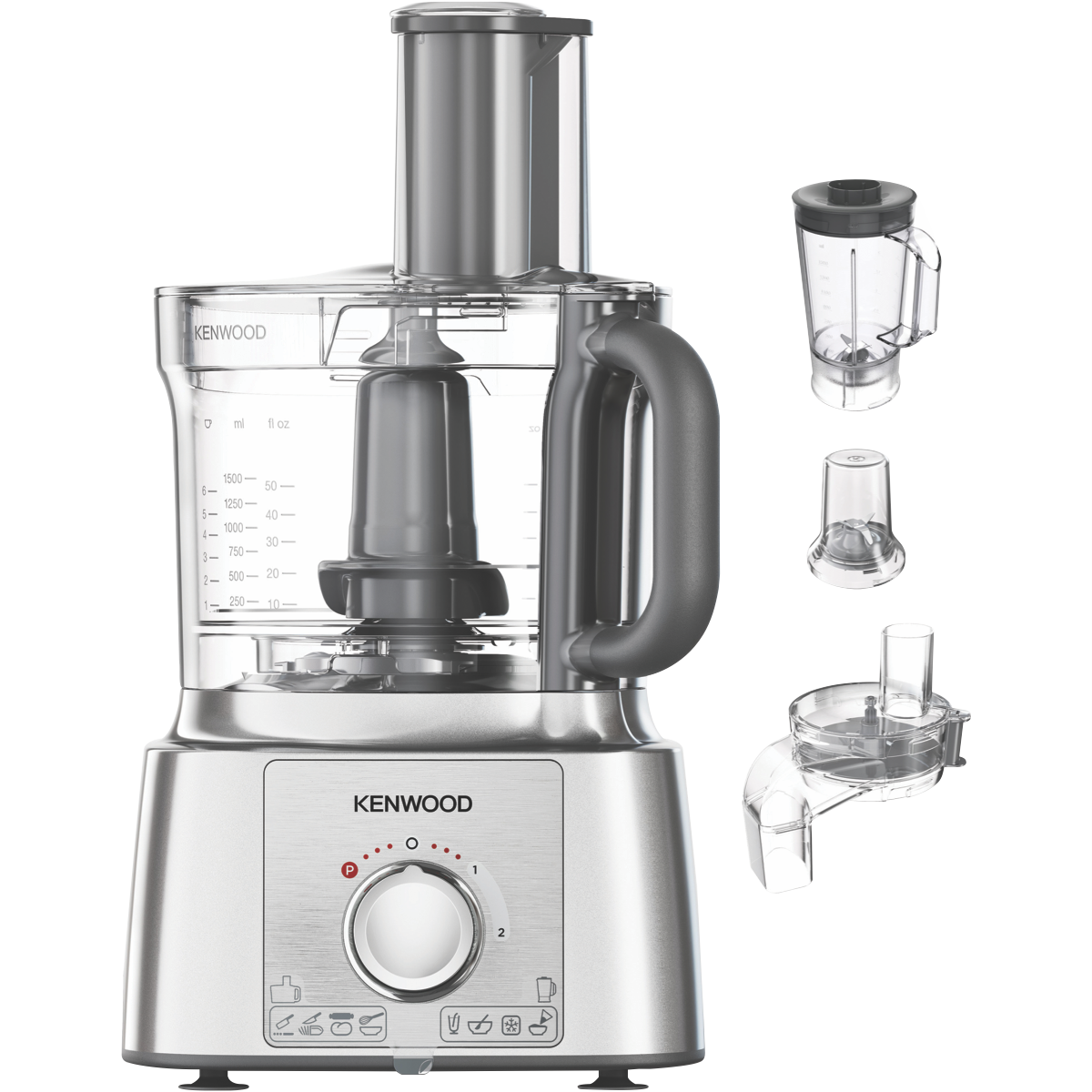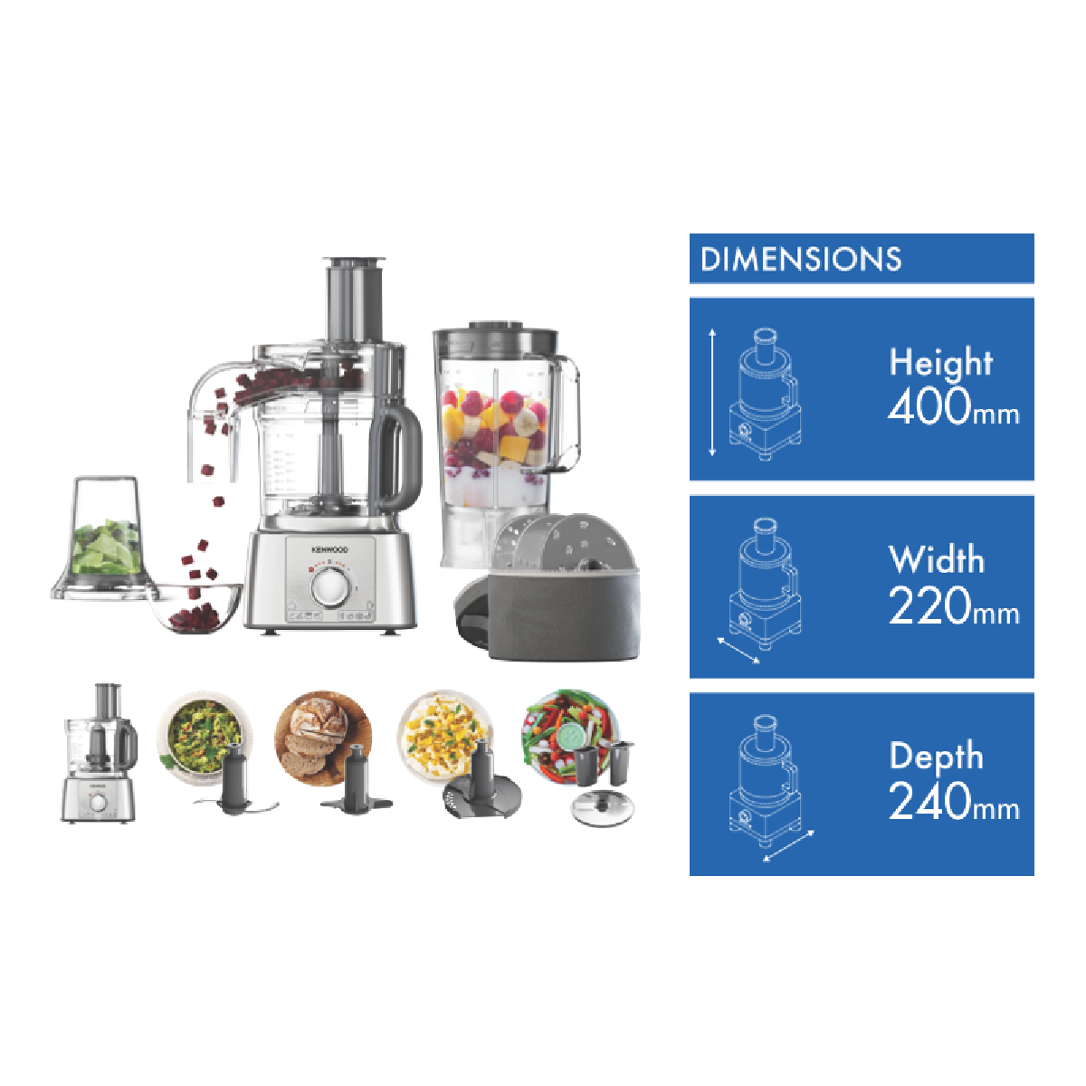 The Kenwood Multipro Express + Food Processor is the all-in-one system for your kitchen needs. With its 1000 watt motor you can grate slice blend knead puree whisk and juice ingredients with ease. The plastic body with stainless steel panel offers durability while the white and metal design adds modern flair. Prepare meals efficiently with the 3 litre bowl capacity dual speeds pulse function and included attachments like the reversible discs dough tool knife blade and more. Dicing serving and rasping are all possible with the Express attachments. Designed for simplicity the dishwasher safe parts make cleanup a breeze. Part of Kenwood's MultiPro family and covered by a 5 year warranty the Kenwood Multipro Express + Food Processor enhances any home chef's meal preparation. The manufacturer's part number for this product is FDP65890SI.