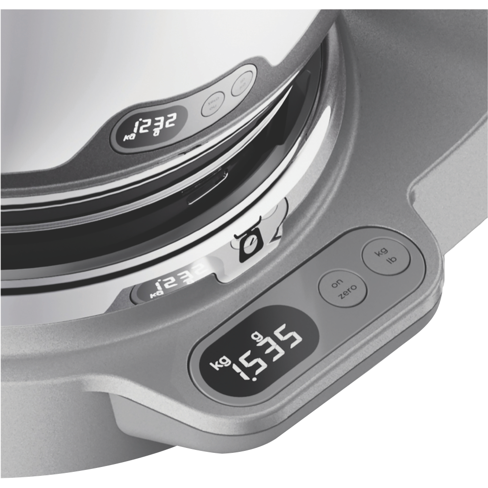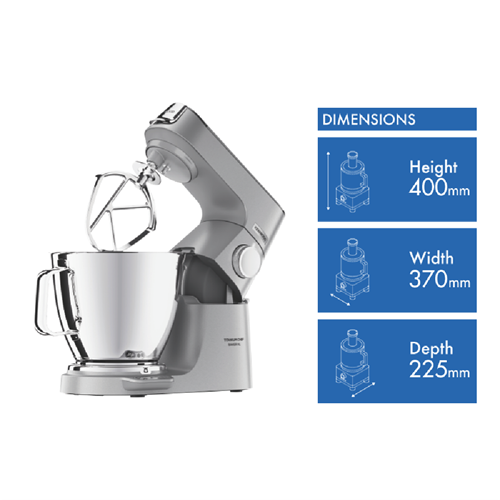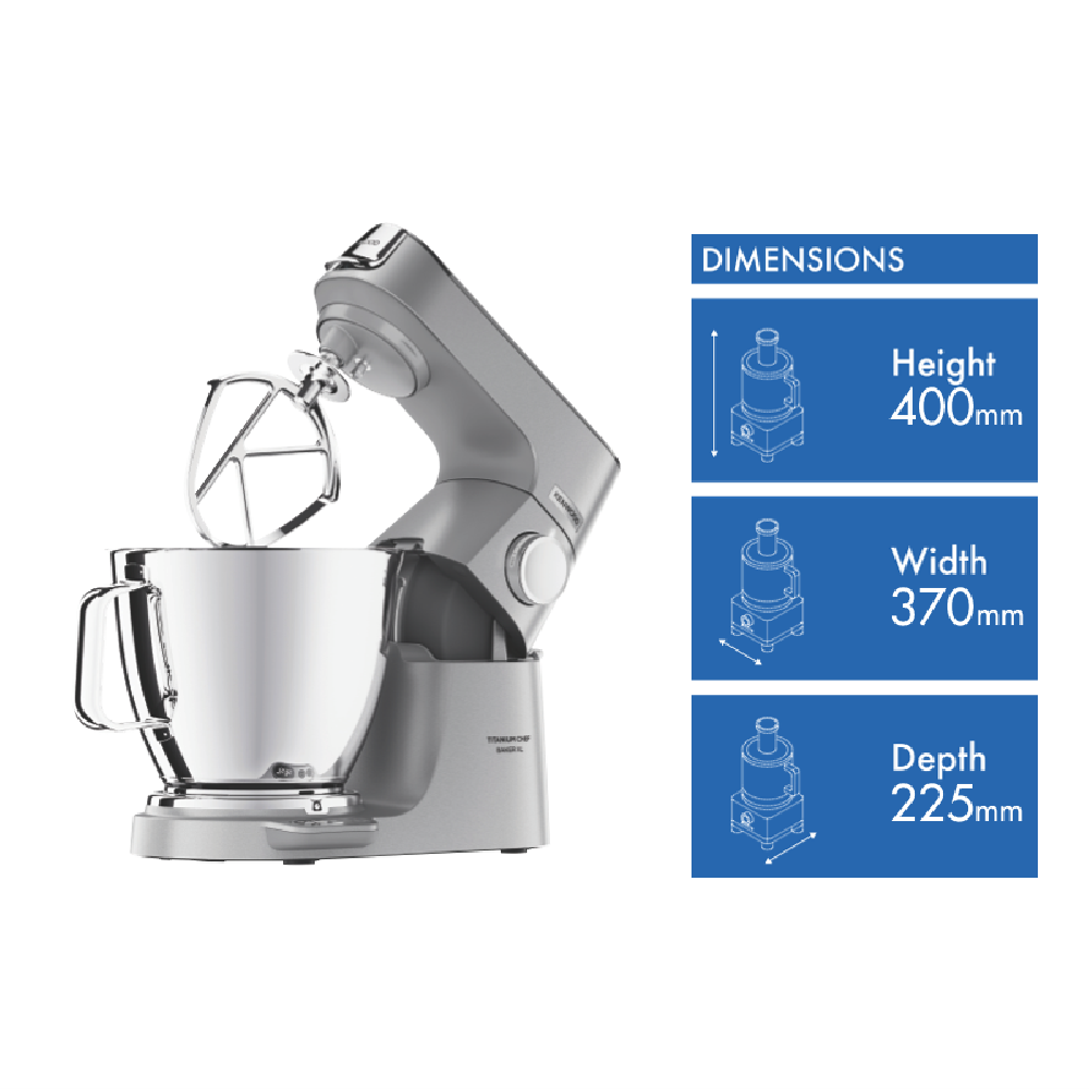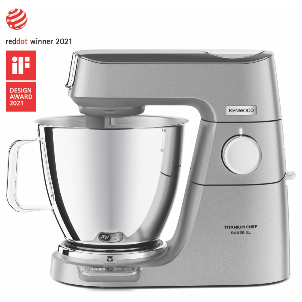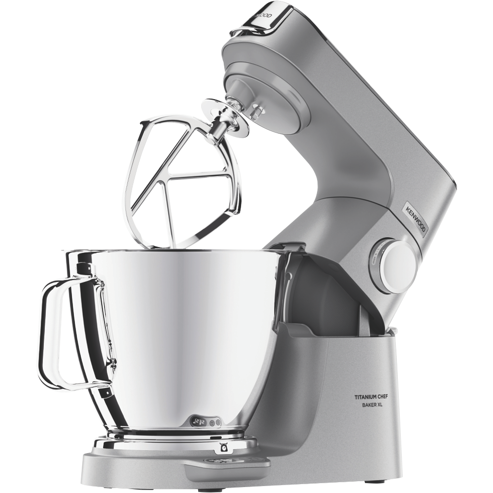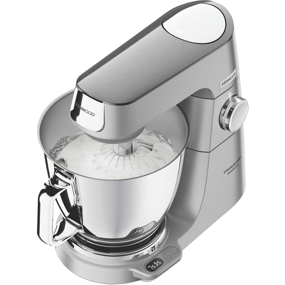 The Kenwood Titanium Chef Baker XL Silver KVL85004SI is highly customisable and powerful ready for all the breads cookie doughs and cakes you could ever dream of. Put the scales away with Kenwood's built in Easy Weigh system allowing you to weigh straight into any optional attachment like a blender or juicer with no mess or fuss. Turn up your kitchen with a digitally controlled 1200W motor dual nested bowls making a frosting mix easily doable right after your cake and planetary mixing ensuring the bowl is perfectly scraped and combined just like hand mixing. Get around the 25 optional attachments not including the stellar included whisk dough tool creaming beater and K-beater but definitely including PopTops allowing you to customise your stand mixer's top panel colour for a truly great look in the kitchen.