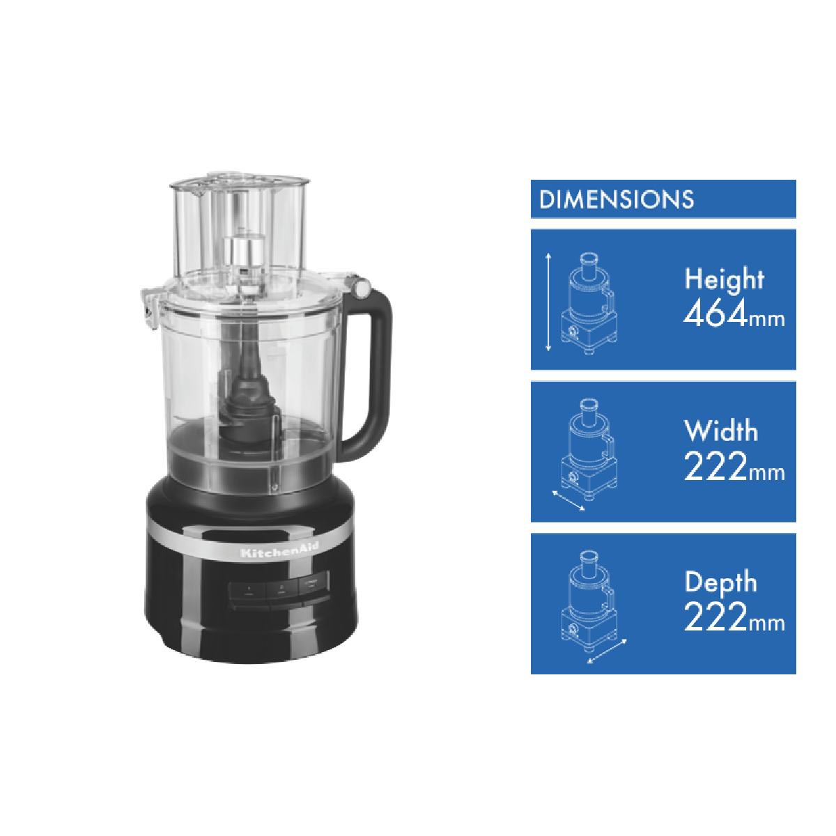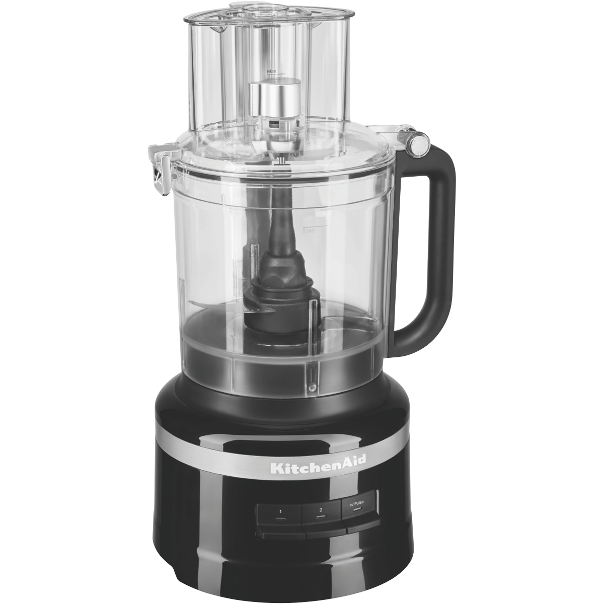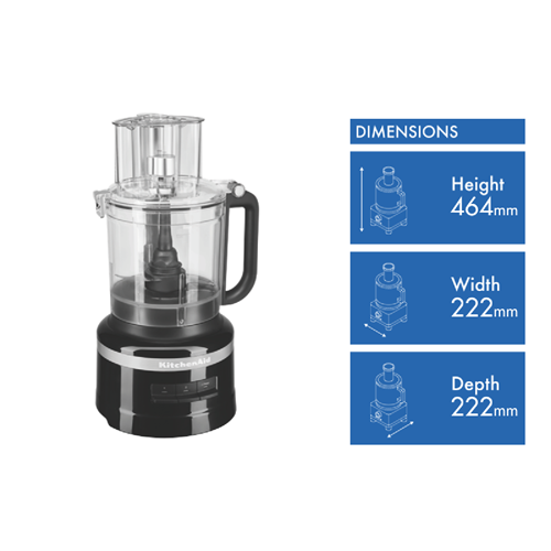 Take your kitchen creations to the next level with the KitchenAid 13 Cup Food Processor in sleek Onyx Black. This powerful food processor makes quick work of all your prep with a 400 watt motor and 3 versatile speeds. The generous 13 cup Tritan work bowl tackles large batches with ease while the multi-purpose blade dough blade and reversible shredding/slicing discs provide precision for any task. Slice shred knead puree and more with the turn of a dial. The wide mouth feed tube and multi-sized food pushers let you process foods vertically for fast continuous slicing and shredding. Constructed from durable plastic this processor is built to perform and designed to impress from its soft-grip handles to the storage caddy for attachments. With a 24 month warranty the KitchenAid 13 Cup Food Processor brings efficiency versatility and style to your countertop. The manufacturer's part number for this product is 5KFP1319AOB.