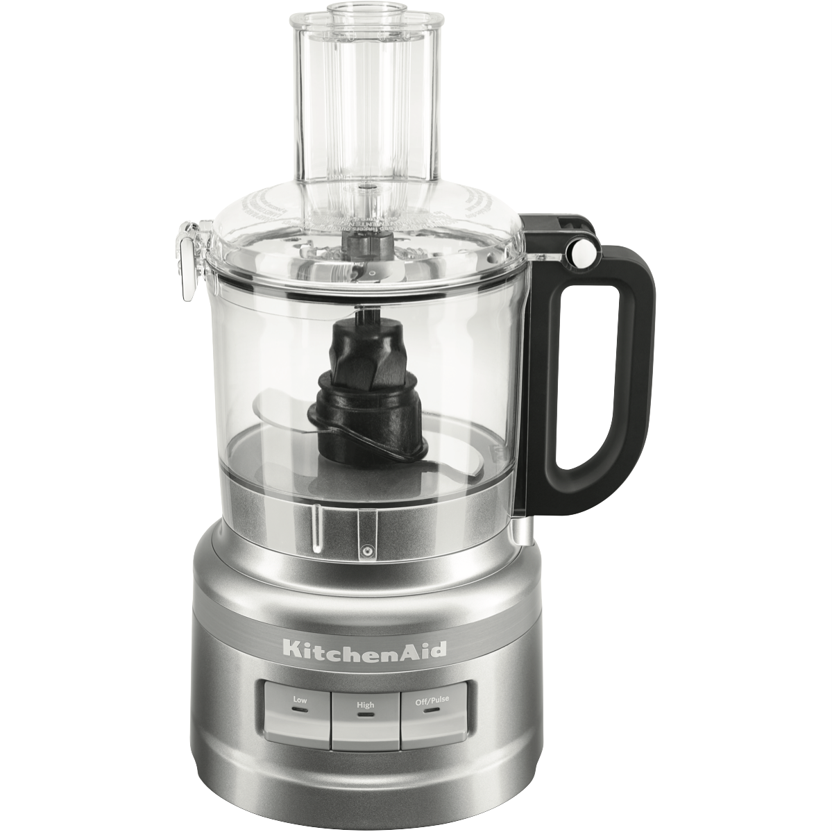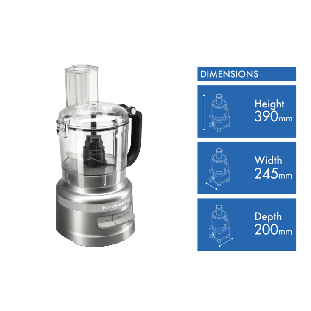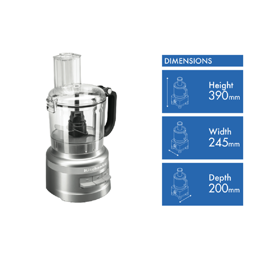 Bring the power of a professional kitchen into your home with the KitchenAid 7 Cup Food Processor. With its sleek silver finish and compact design this versatile food processor is perfect for chopping slicing shredding mixing and pureeing ingredients with precision and ease. The 250 watt motor and 2 speed settings plus pulse provide optimal control for processing anything from soft fruits to hard cheeses. It comes equipped with a 7 cup work bowl multi-purpose blade dough blade reversible disc for slicing and shredding and more. Weighing only 3kg it won't take up much space on your kitchen counter. With BPA free components and a 2 year warranty you can feel confident creating culinary masterpieces for years to come. From dicing onions to kneading dough this food processor makes cooking quick and enjoyable. With the KitchenAid 7 Cup Food Processor you'll have a powerful reliable assistant by your side in the kitchen. The manufacturer's part number for this product is 5KFP0719ACU. Bring your cooking game to the next level and explore all that this versatile food processor has to offer.