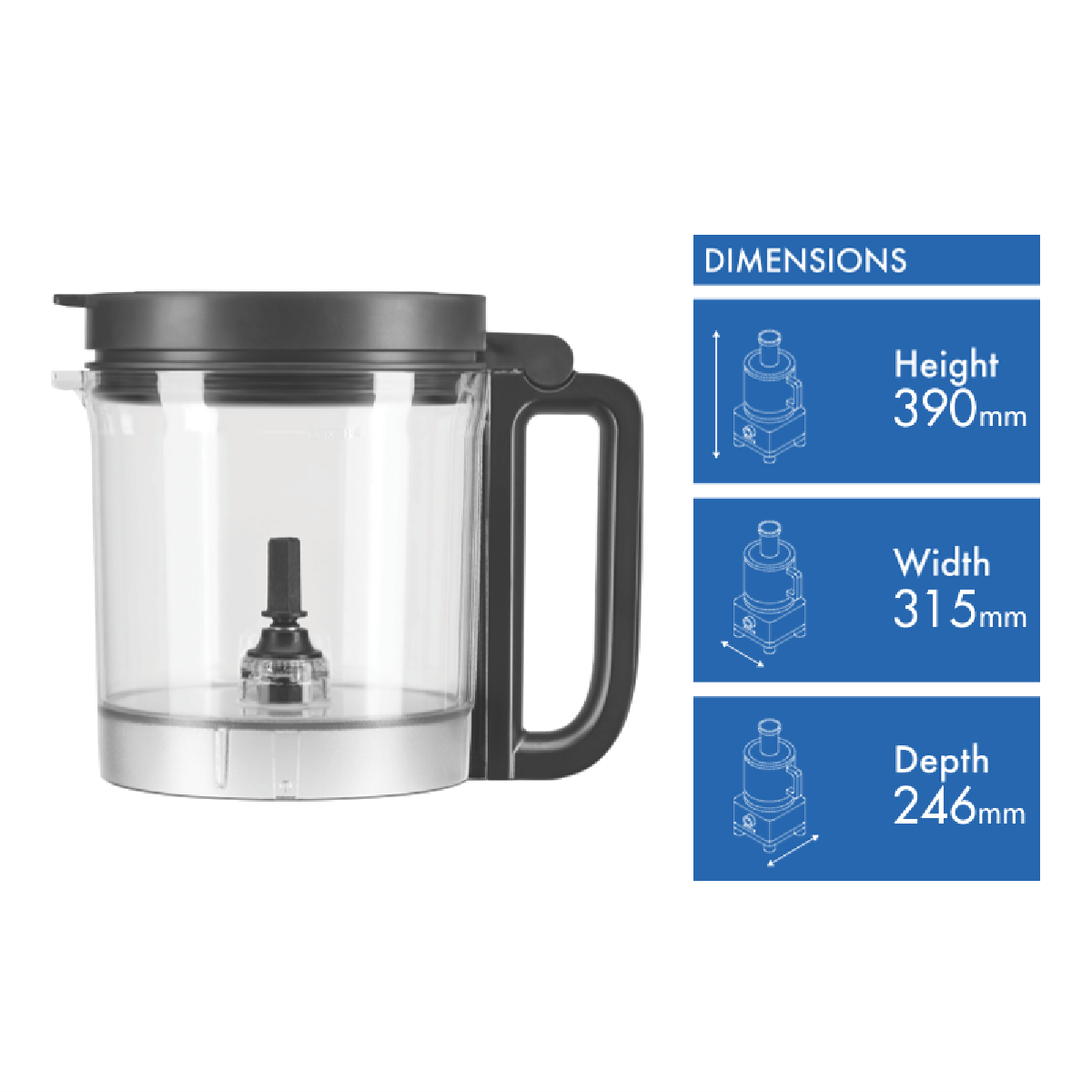 • 2.1 Litre BPA free work bowl with hinged lid and feed tube