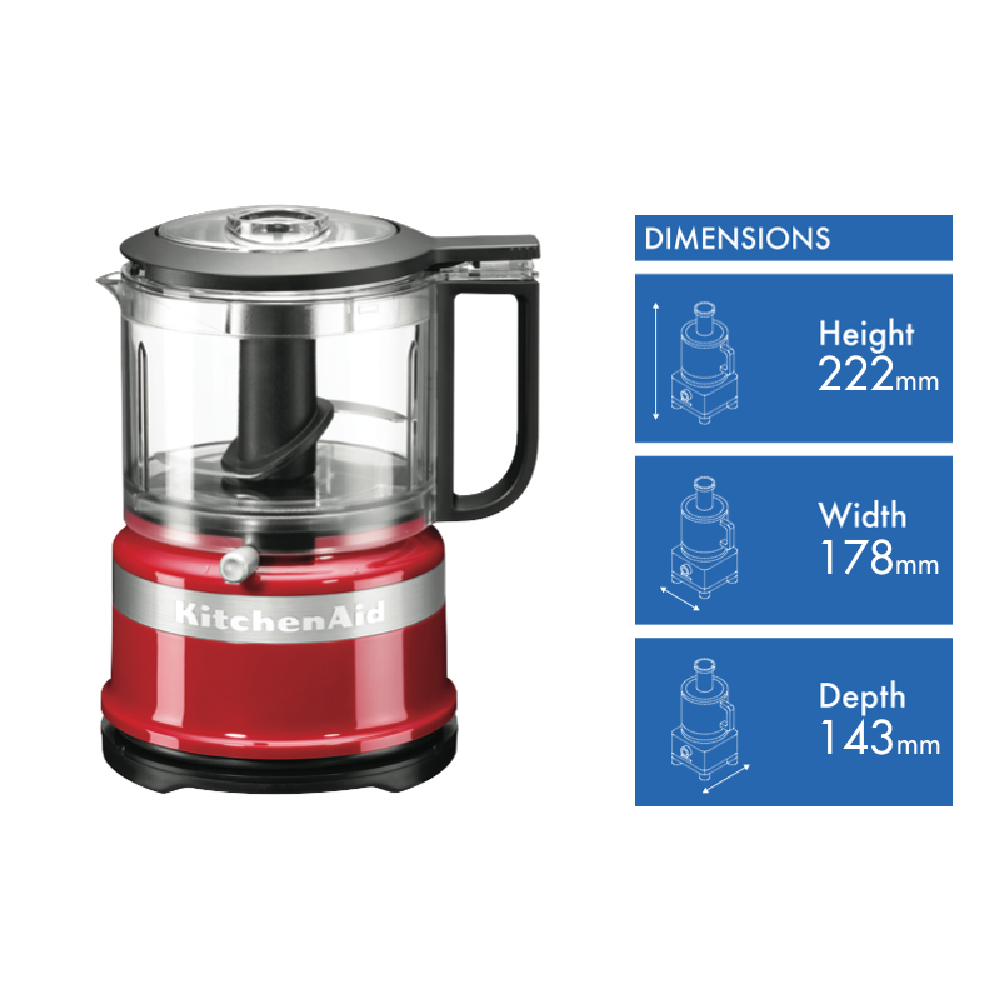 Make food preparation a breeze with this KitchenAid Mini 3.5 Cup Chopper. A compact design makes the mini food processor perfect for smaller tasks while also minimising clean up time. The simple one-touch operation is perfect for quickly dicing veggies or whipping up dressings.