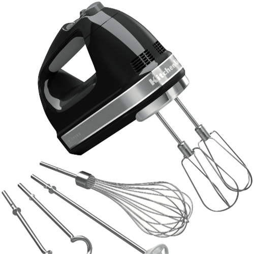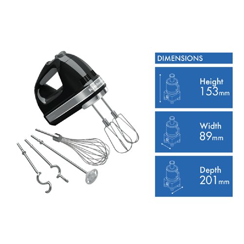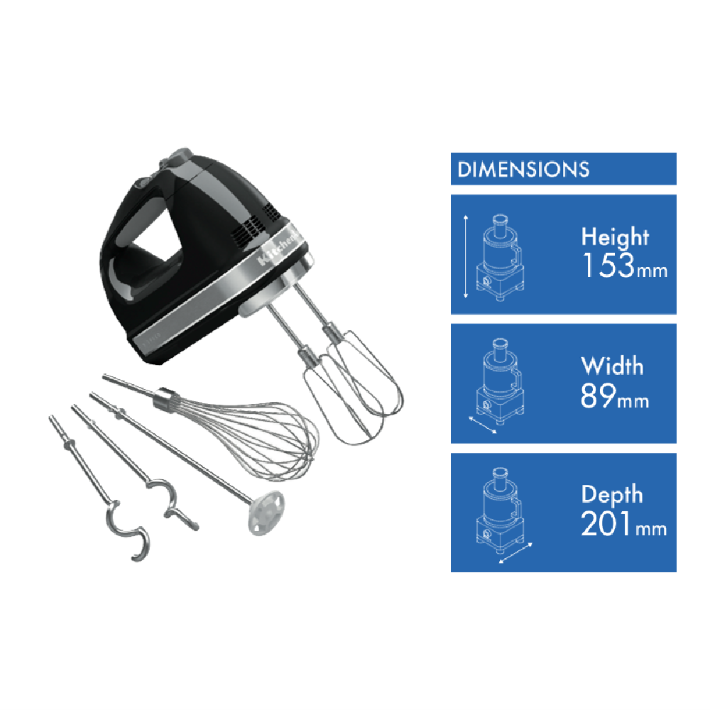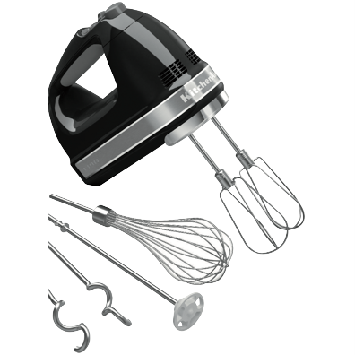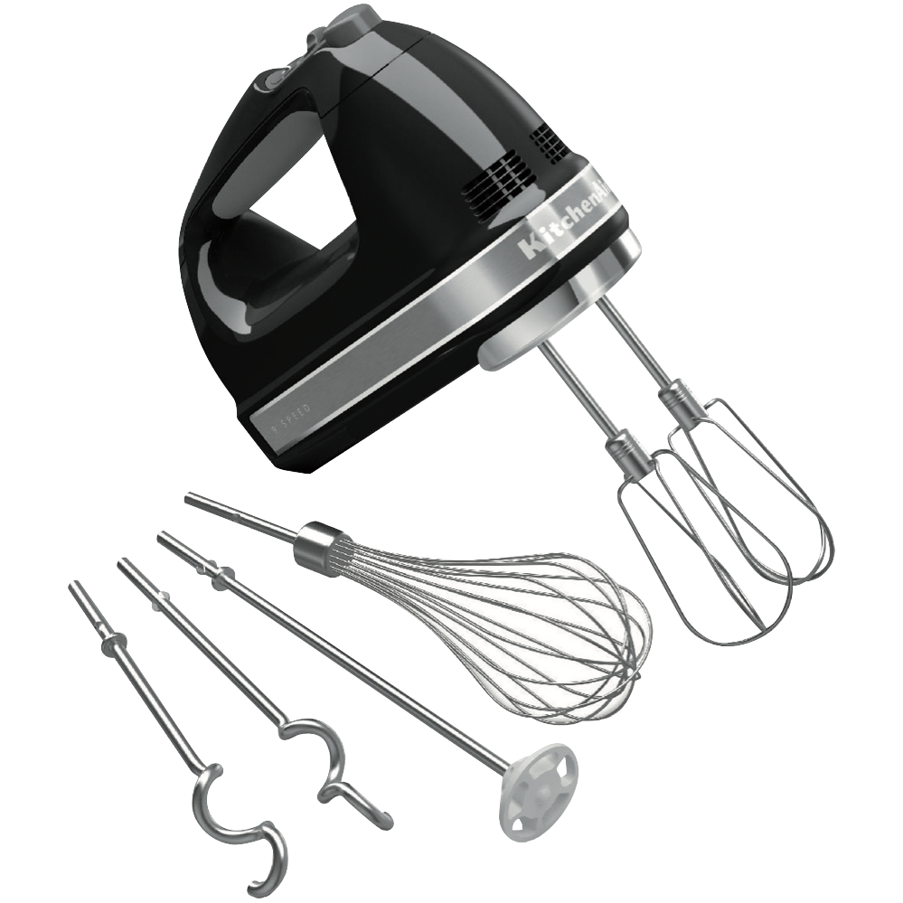 Add a splash of modern style to your kitchen with the sleek new KitchenAid Onyx Black Hand Mixer. This efficient and powerful hand mixer features an 85-watt motor and 9 speed settings to whip up light fluffy egg whites or creamy mashed potatoes with ease. The soft grip handle provides comfort even during extended mixing while the single-button ejector allows you to remove accessories without the hassle. Complete with stainless steel Turbo Beater II accessories and dough hooks this hand mixer makes baking a breeze. With a lightweight and compact design the KitchenAid Artisan Onyx Black Hand Mixer can be easily stored in a drawer or cabinet when not in use. Dishwasher safe parts allow for quick clean up after whipping up your favorite recipes. Backed by KitchenAid's 2 year warranty this hand mixer delivers solid performance and durability to meet all your mixing needs. The manufacturer's part number for this product is 5KHM926AOB. Discover how the KitchenAid Onyx Black Hand Mixer can inspire your culinary creativity today.