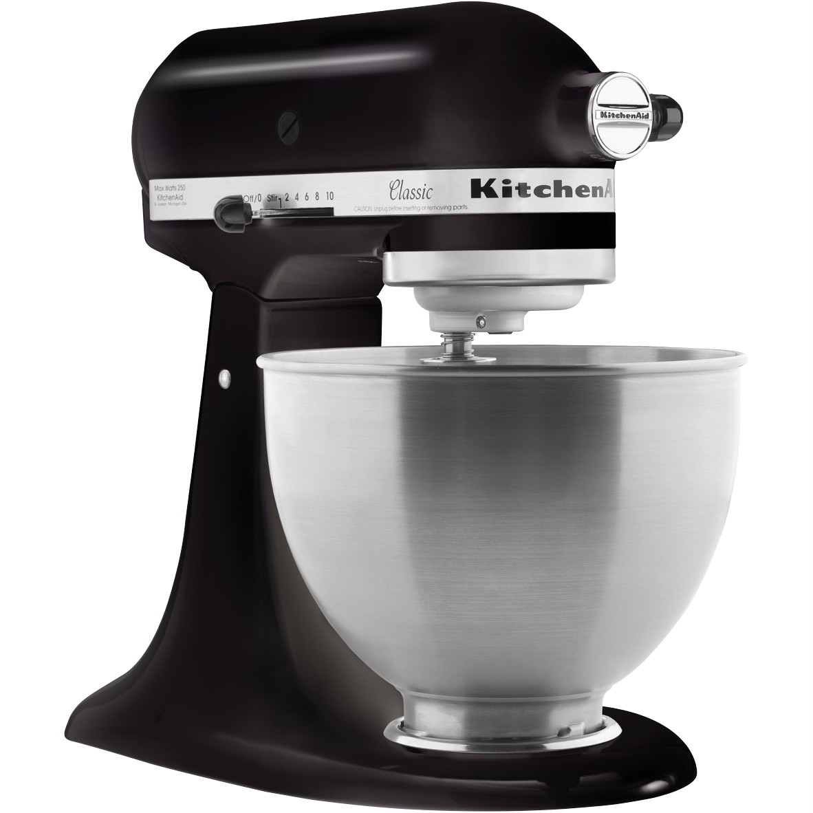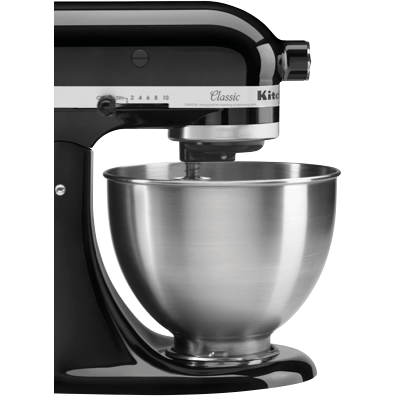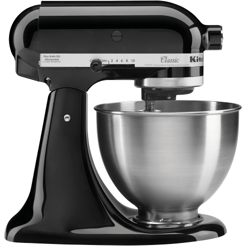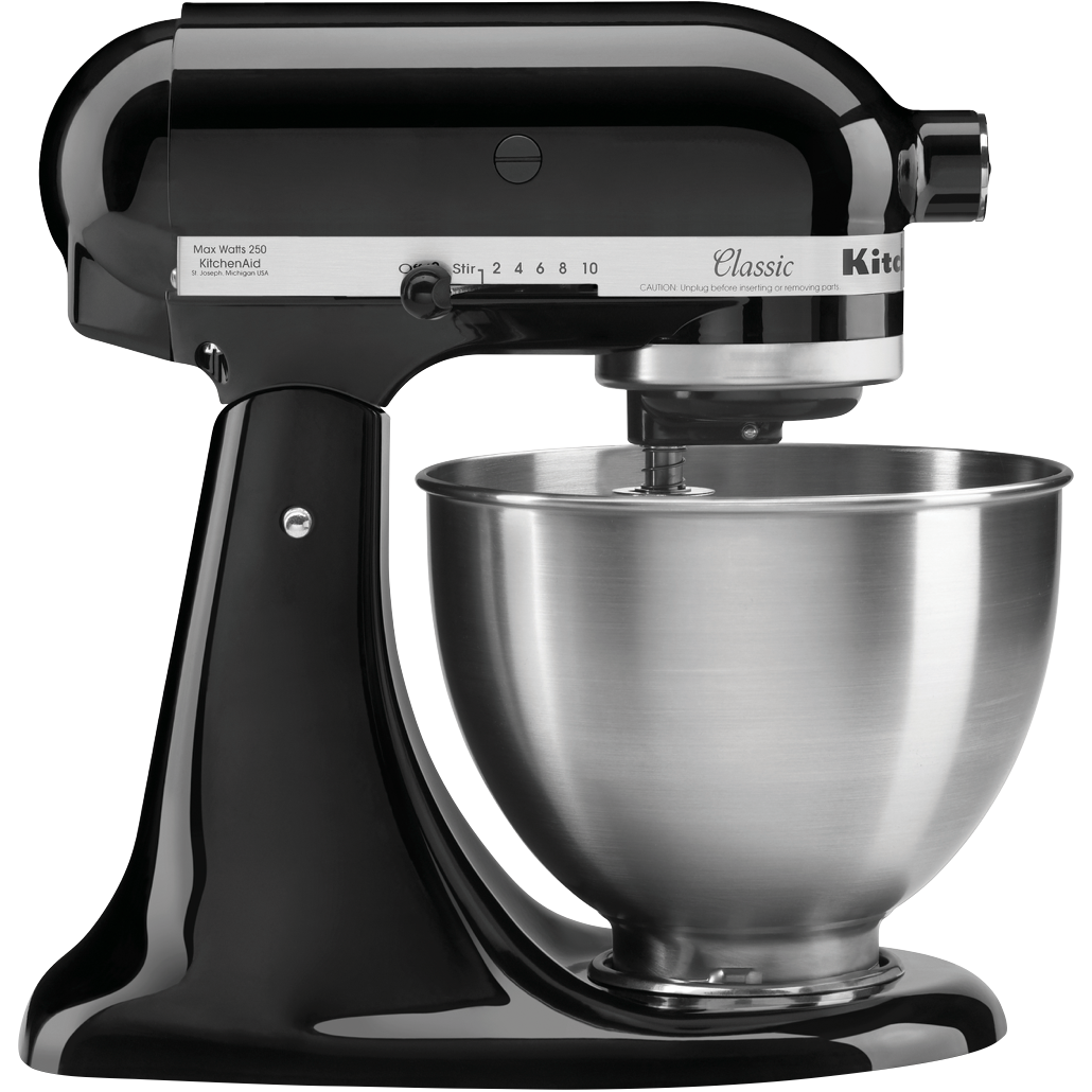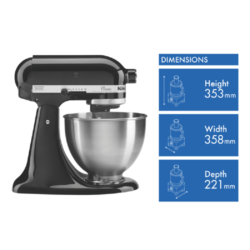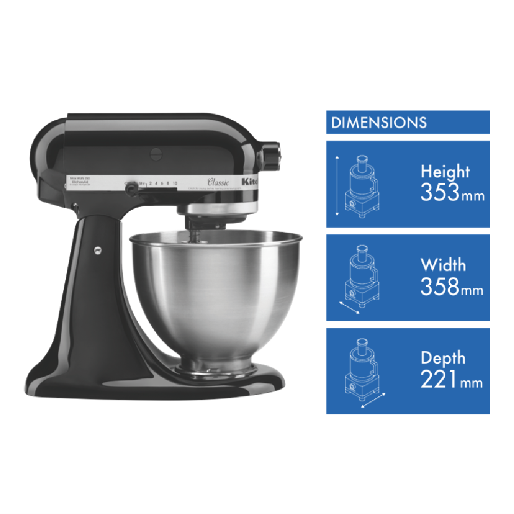 Discover the power of a classic with the KitchenAid Onyx Black Classic Stand Mixer. This iconic mixer is crafted with a durable metal die cast construction and features the planetary mixing action that KitchenAid is known for allowing the beater to touch 67 different points in the bowl for fast thorough mixing. With 10 speed settings and a 4.3L stainless steel bowl you can mix knead and whip ingredients with ease. The locking tilt-head design provides convenient access for attaching accessories. This versatile mixer comes equipped with essential attachments including a flat beater wire whisk and dough hook. Weighing 11.5kg it has a sturdy build that will stand the test of time. The 5 year manufacturer's warranty provides peace of mind. Bring home the timeless KitchenAid Classic Stand Mixer in a sleek Onyx Black finish and unlock endless possibilities in your kitchen today. The manufacturer's part number for this product is 5KSM45AOB.