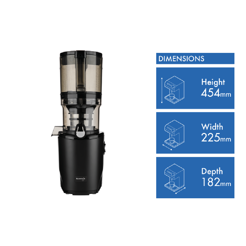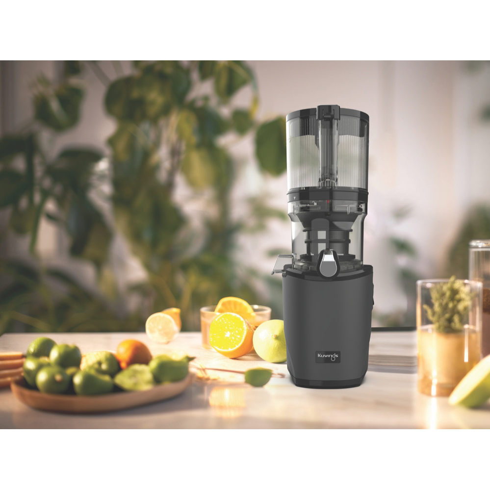 Want to juice without the hassle? The Kuvings Hands Free Cold Press Juicer makes it easy. This matte pearl black juicer has a big 2 litre hopper so you can add lots of fruit and veg at once. It uses gentle squeezing to keep nutrients in your juice. The 200 watt motor is strong but quiet. You get a 1.3 litre juice cup and a 1 litre pulp cup plus a fine mesh strainer for smooth juice. Its square base keeps it steady while juicing. When you're done just rinse under the tap and wipe clean. It even comes with a sorbet strainer for frozen treats. The AUTO8B juicer weighs 5.3kg and has a 1 year warranty.